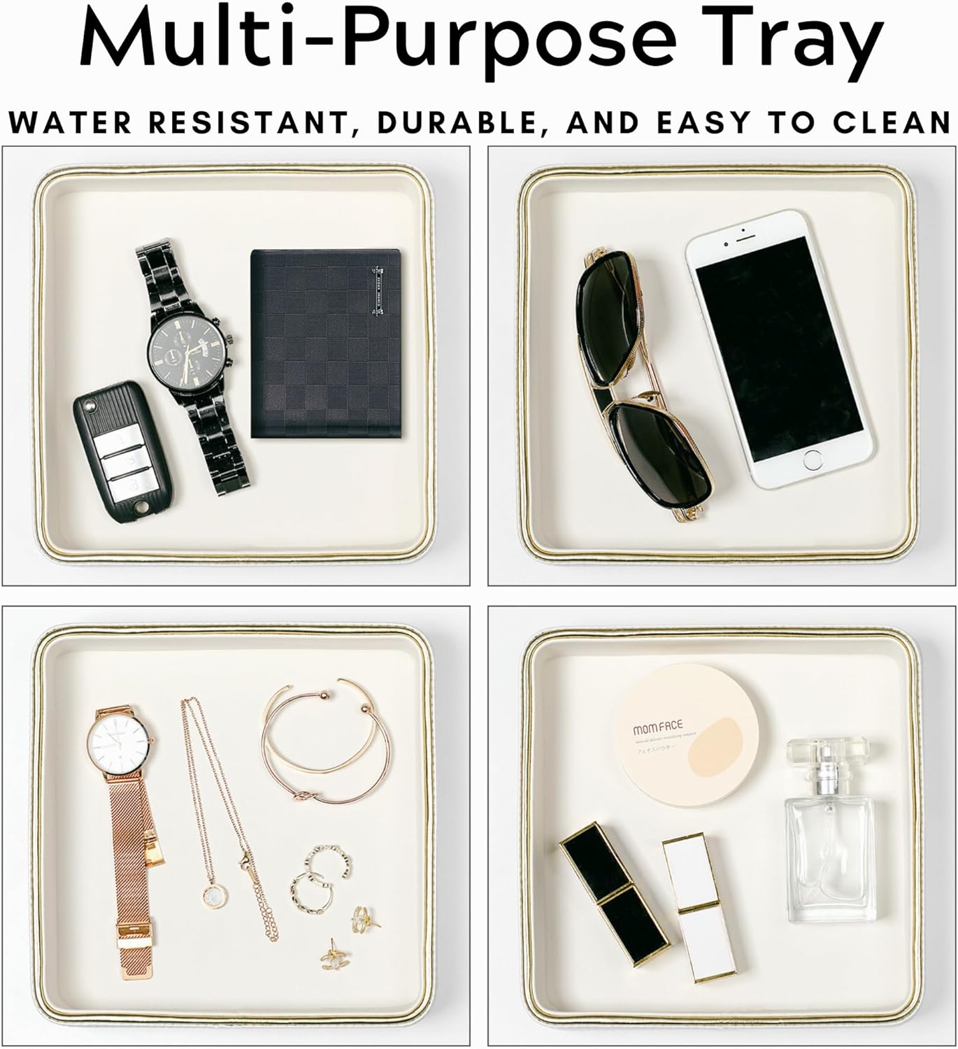 - ๐ Durability Meets High Design: Crafted from an easy-to-clean small desk tray, our bedside organizer is more than just a pretty face. Hand-stitched for durability, with a water-resistant finish and raised edges to secure your items, it blends practicality and luxury in every detail. Whether youโre searching for a jewelry tray for women, a watch tray for men, or stylish dresser decor for bedroom aesthetic, this versatile small vanity tray is the perfect choice to elevate your space.