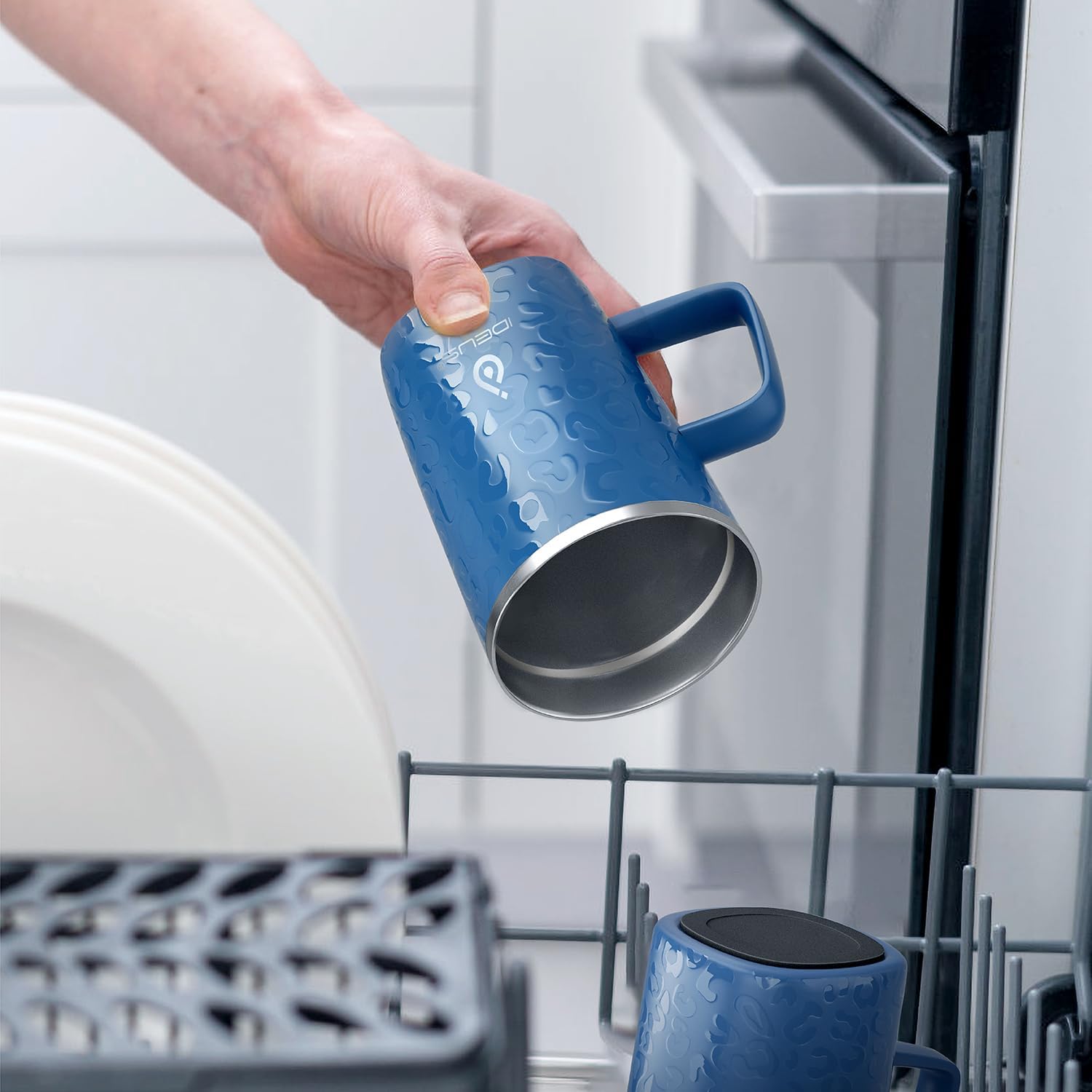 Ideus Vacuum Insulated Coffee Mug, 16oz Reusable Stainless Steel Thermal Double Walled cup with Handle and Slider Lid for Hot & Cold Beverages, BPA Free (Leapord Blue)