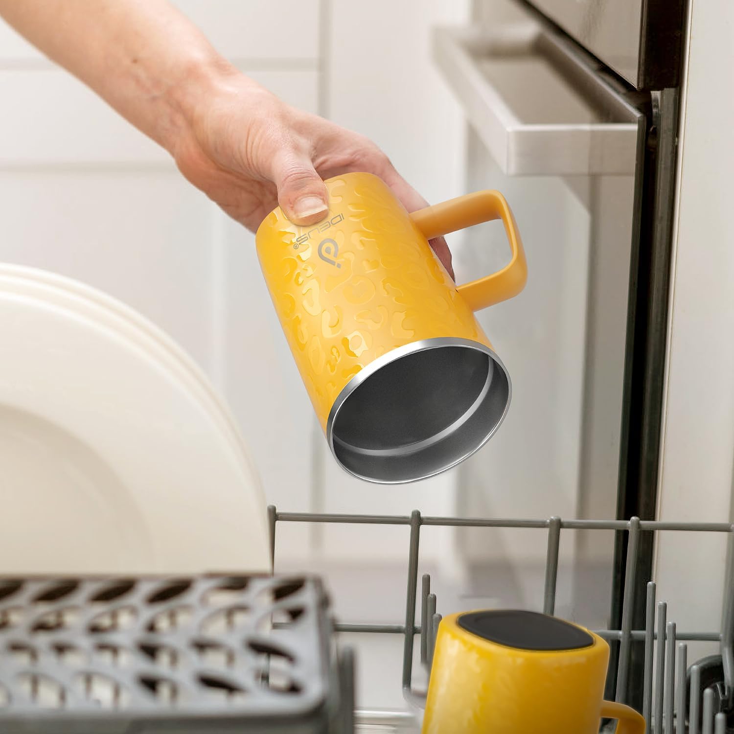 Ideus Vacuum Insulated Coffee Mug, 16oz Reusable Stainless Steel Thermal Double Walled cup with Handle and Slider Lid for Hot & Cold Beverages, BPA Free (Leapord Honey)