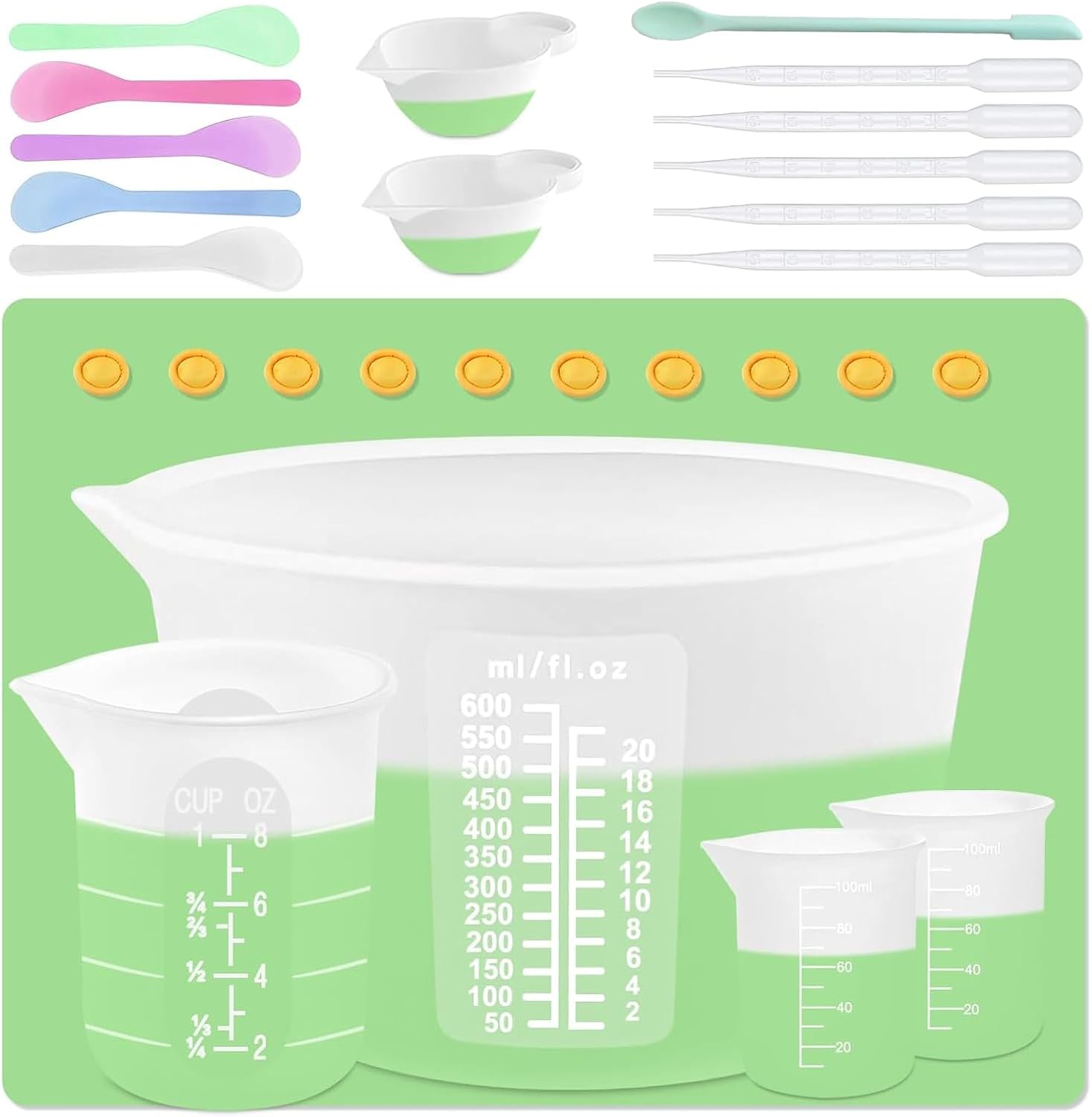 Silicone Measuring Cups Kit for Resin, Epoxy Supplies Set with 600ml, 250ml & 100ml Silicone Cups, Reusable Resin Supplies Cups with Silicone Mat, Stir Sticks, Mixing Cups for Molds Arts, Crafts