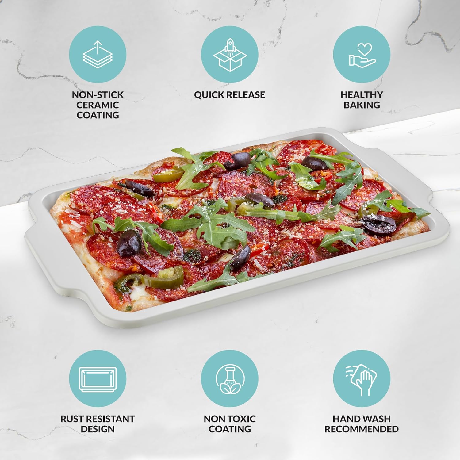 - EASY TO CLEAN: Our ceramic baking sheet is nonstick, making it super easy to clean. No more scrubbing on this cookie pan. Simply rinse off or toss in the dishwasher.