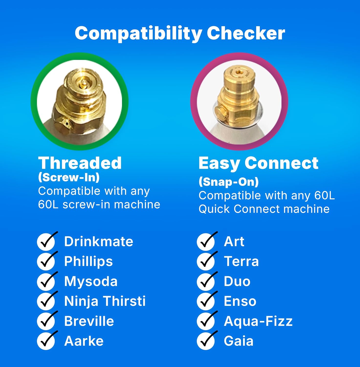 - [Canister Compatibility] We don't mind if you call it a canister, cylinder, tank, or cartridge! But remember that our pink capped, Easy Connect canisters are compatible with all SodaStream Quick Connect soda makers including ART, TERRA and Duo. If you own a soda maker which requires a 'screw-in' canister, you will need to purchase our green capped, Threaded canisters.