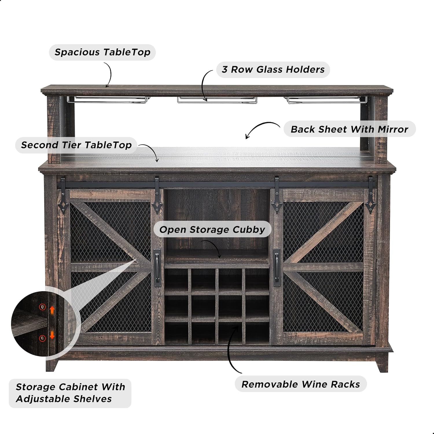 - Chic and Versatile Cabinet: The classic barn and iron mesh sliding door blends farm and industrial styles, quality sliding track ensures quiet and smooth sliding, allowing you to hide or reveal cabinet areas freely. Designed with black metal iron tone hardware, adding charm and aesthetic appeal to the cabinet. As a storage cabinet that combines beauty and functionality can be versatile as a coffee bar in the kitchen, wine cabinet in the dining room, sideboard buffet cabinet in the living room