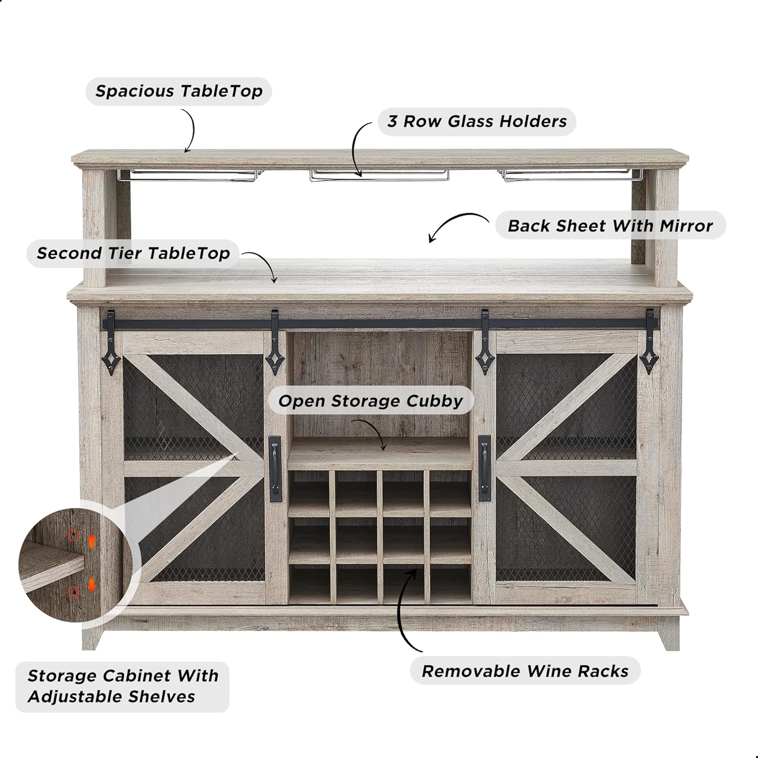 - Special Feature : Adjustable Shelf, LED Lights, Metal Slding Barn Door