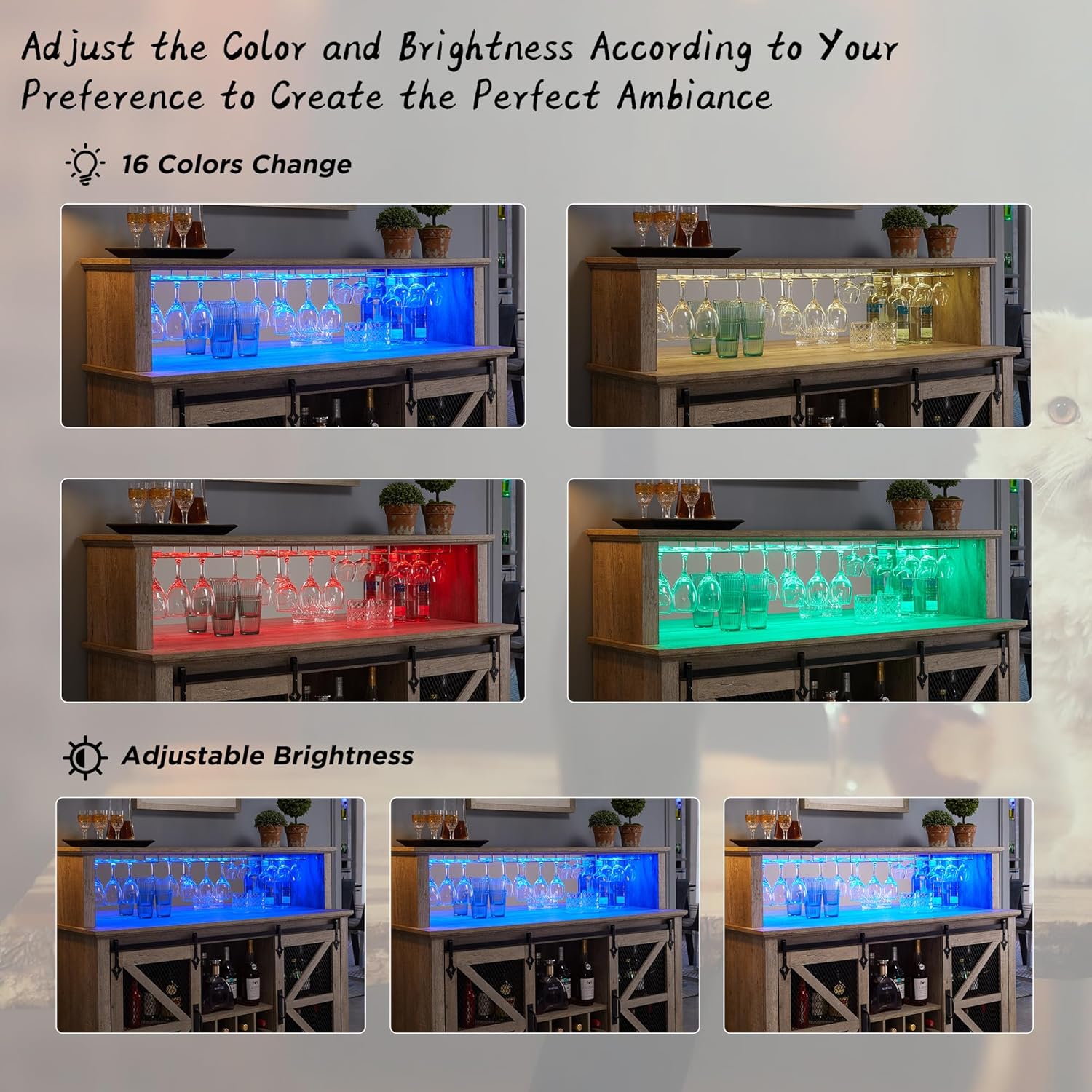 - Bar Cabinet With LED Lights: As home bar cabinet, is equipped with an RGB LED light strip with 16 colors, 4 flashing modes, and brightness adjustment function to make the wine cabinet look so fancy and create a relaxing and cheerful ambiance in the room which is perfect for wine tasting, parties, and showcasing wine collection. With a soft glow that illuminates the stemware and wine bottles below, you can effortlessly locate and retrieve the desired bottle without fumbling in the dark