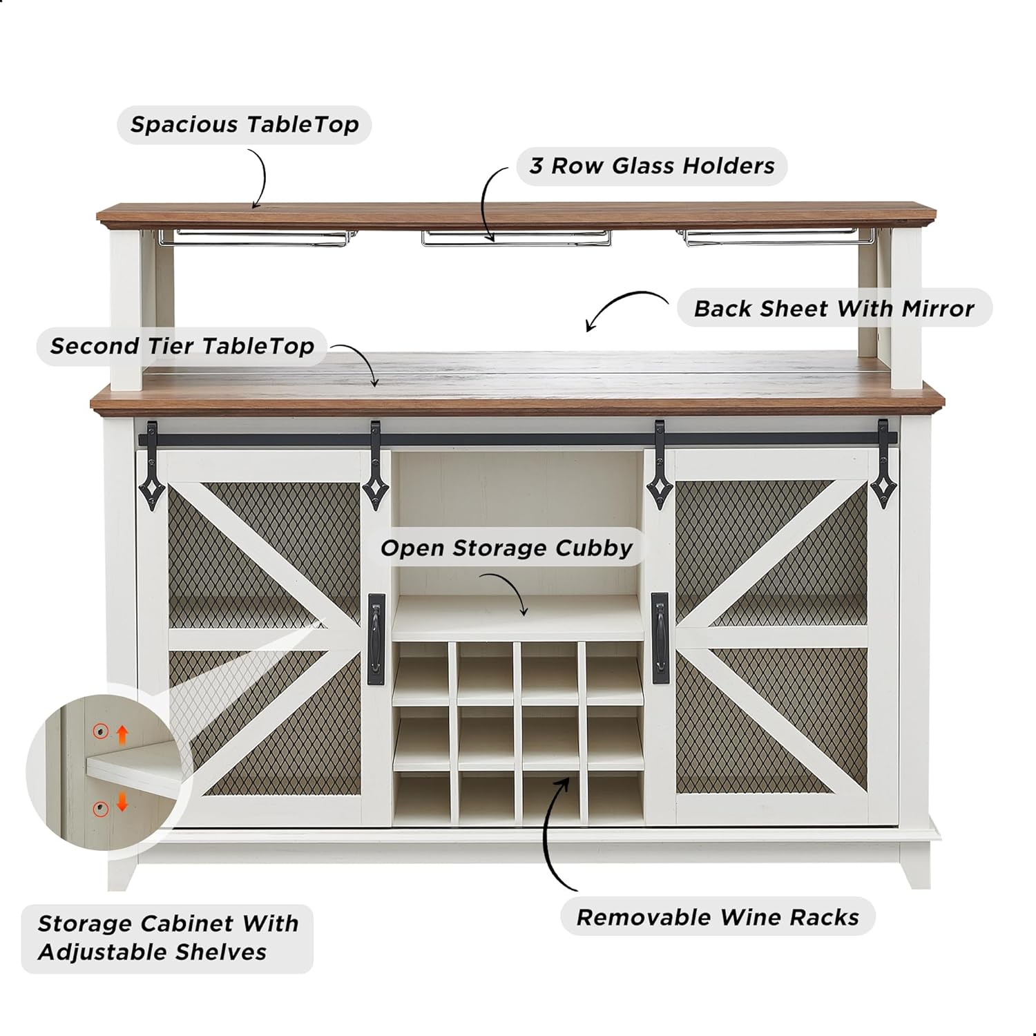 - Chic and Versatile Cabinet: The classic barn and iron mesh sliding door blends farm and industrial styles, quality sliding track ensures quiet and smooth sliding, allowing you to hide or reveal cabinet areas freely. Designed with black metal iron tone hardware, adding charm and aesthetic appeal to the cabinet. As a storage cabinet that combines beauty and functionality can be versatile as a coffee bar in the kitchen, wine cabinet in the dining room, sideboard buffet cabinet in the living room