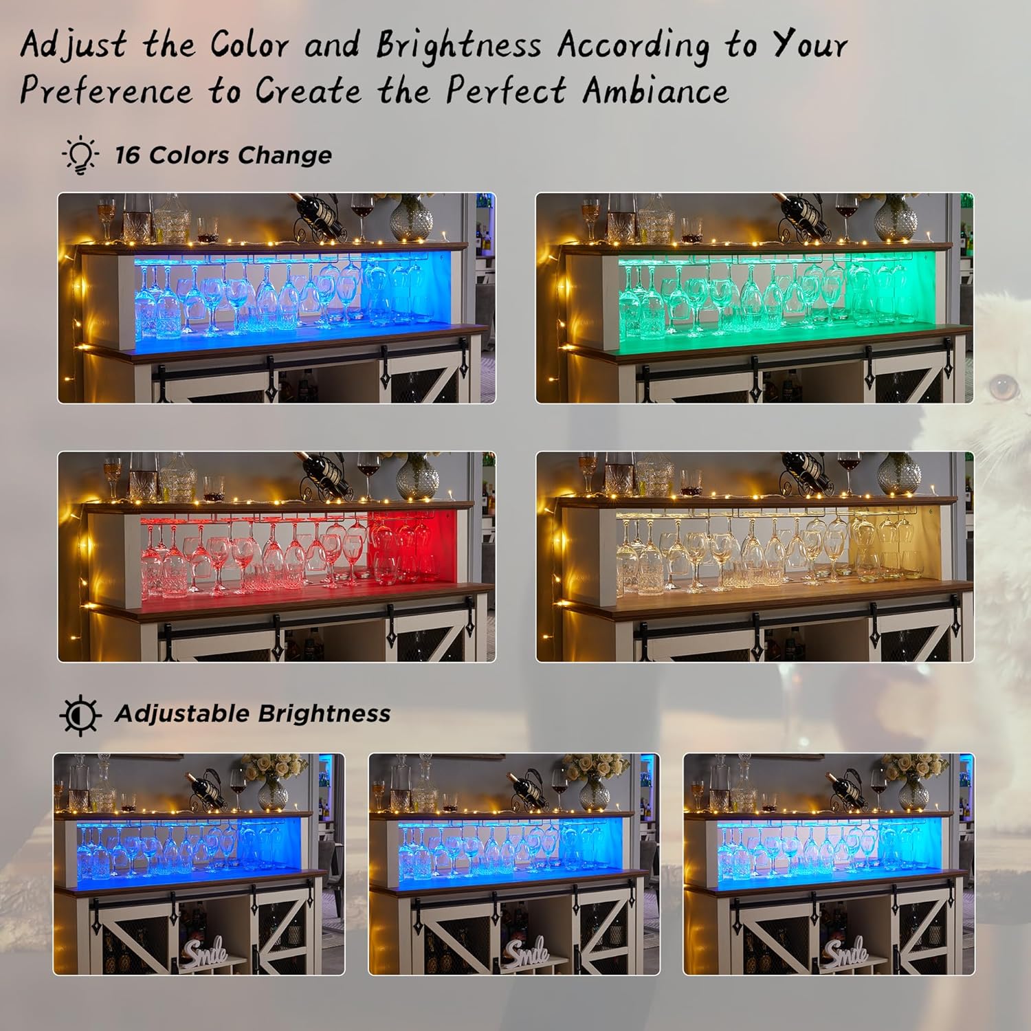 - Bar Cabinet With LED Lights: As home bar cabinet, is equipped with an RGB LED light strip with 16 colors, 4 flashing modes, and brightness adjustment function to make the wine cabinet look so fancy and create a relaxing and cheerful ambiance in the room which is perfect for wine tasting, parties, and showcasing wine collection. With a soft glow that illuminates the stemware and wine bottles below, you can effortlessly locate and retrieve the desired bottle without fumbling in the dark