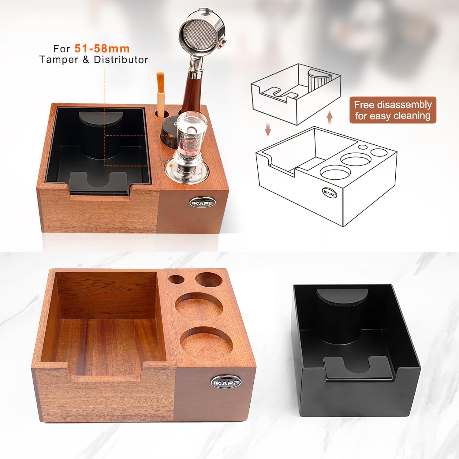 - Neat and Organized - The multi-functional five-in-one Knock Box provides the perfect solution for organizing your espresso accessories. With clever internal compartments, it can accommodate espresso distributors, tampers, portafilters, and more, keeping your coffee tools neatly organized and easily accessible. Meanwhile, you can distribute and tamp coffee powder on the Knock Box to make the coffee experience more perfect