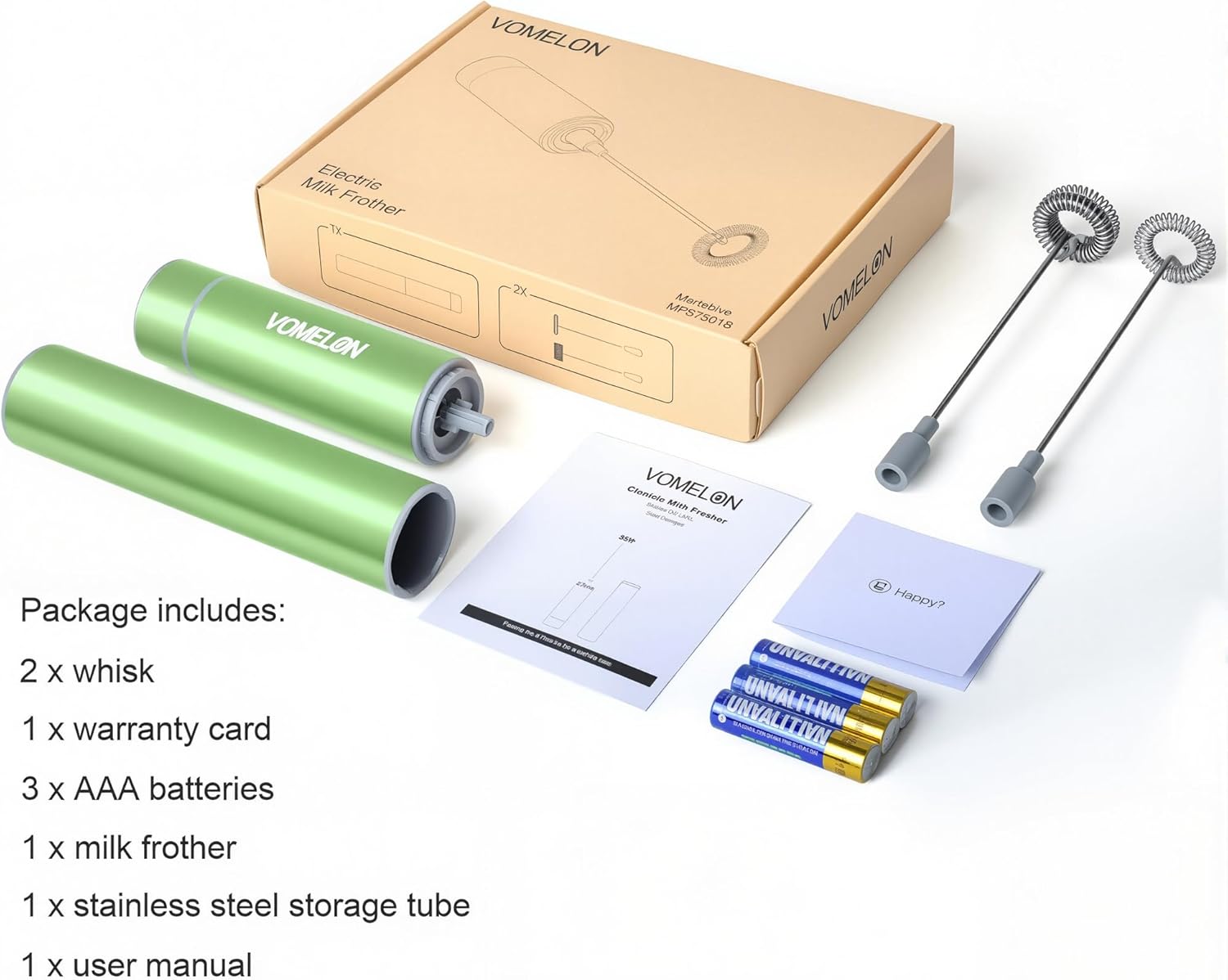 - PREMIUM QUALITY AND CONVENIENCE: Crafted from food-grade 304 stainless steel, the Vomelon Milk Frother guarantees durability and safety. The sleek stainless steel housing, coupled with two detachable whisk heads, adds convenience to your frothing experience. With the included three AAA batteries, this frother delivers powerful performance at 19,000 RPM. Enjoy the benefits of a noiseless operation and the ease of two-speed settings at the press of a button.
