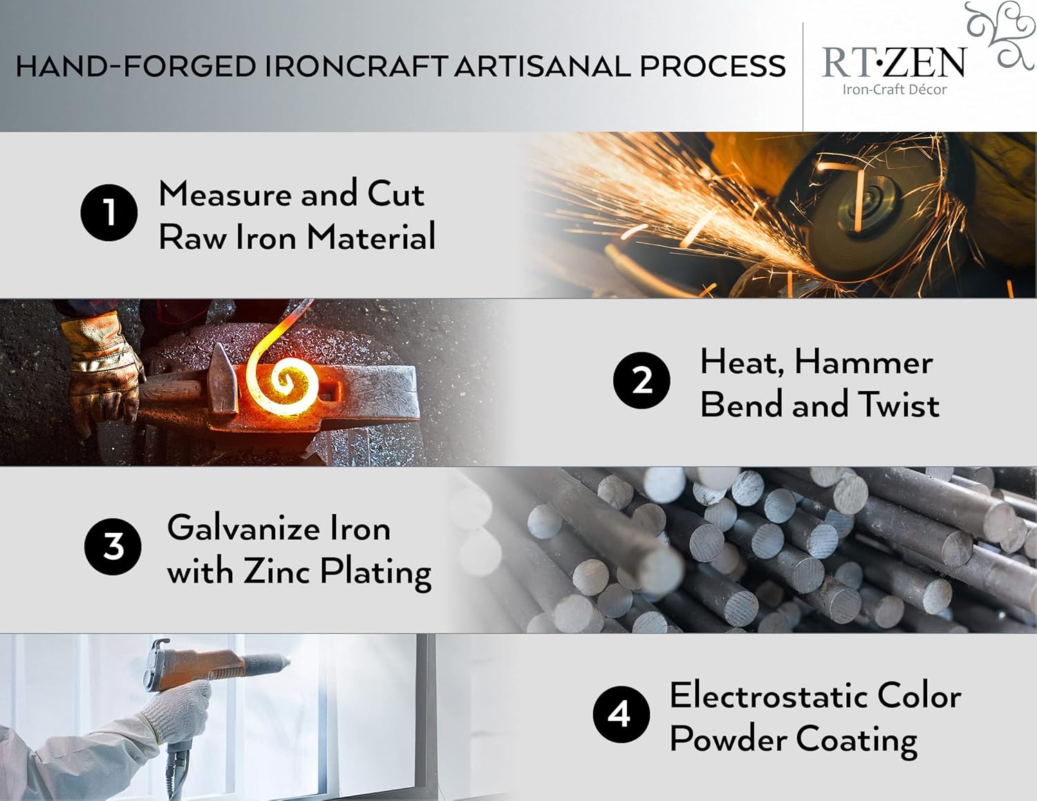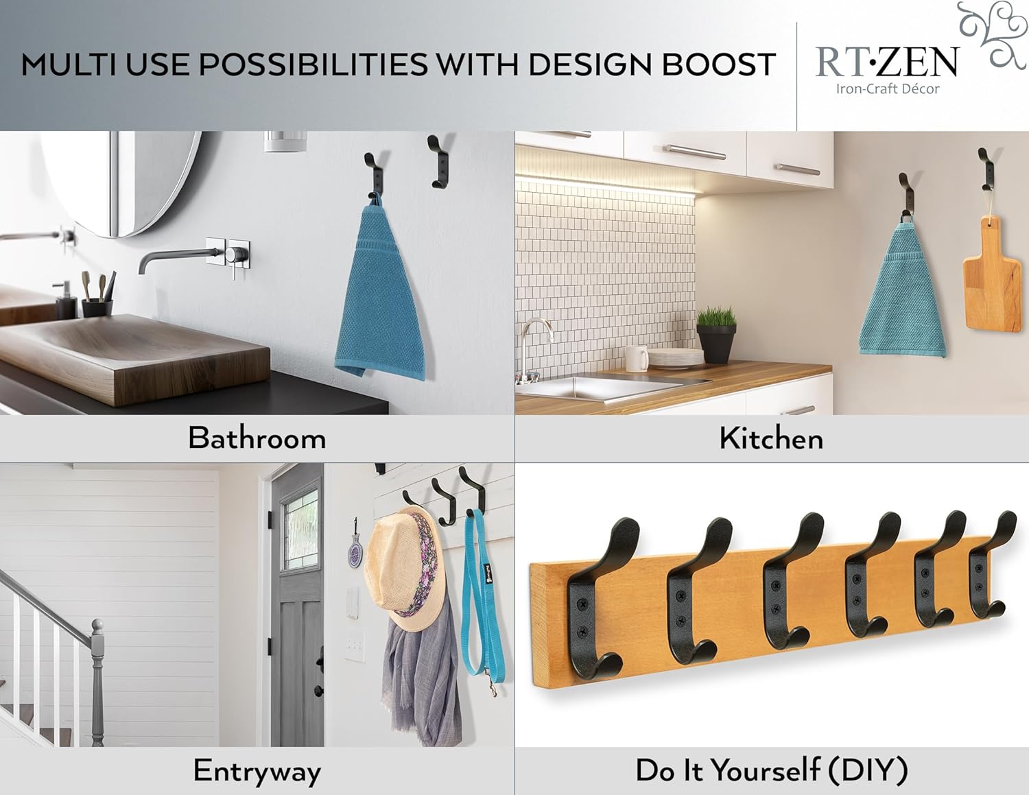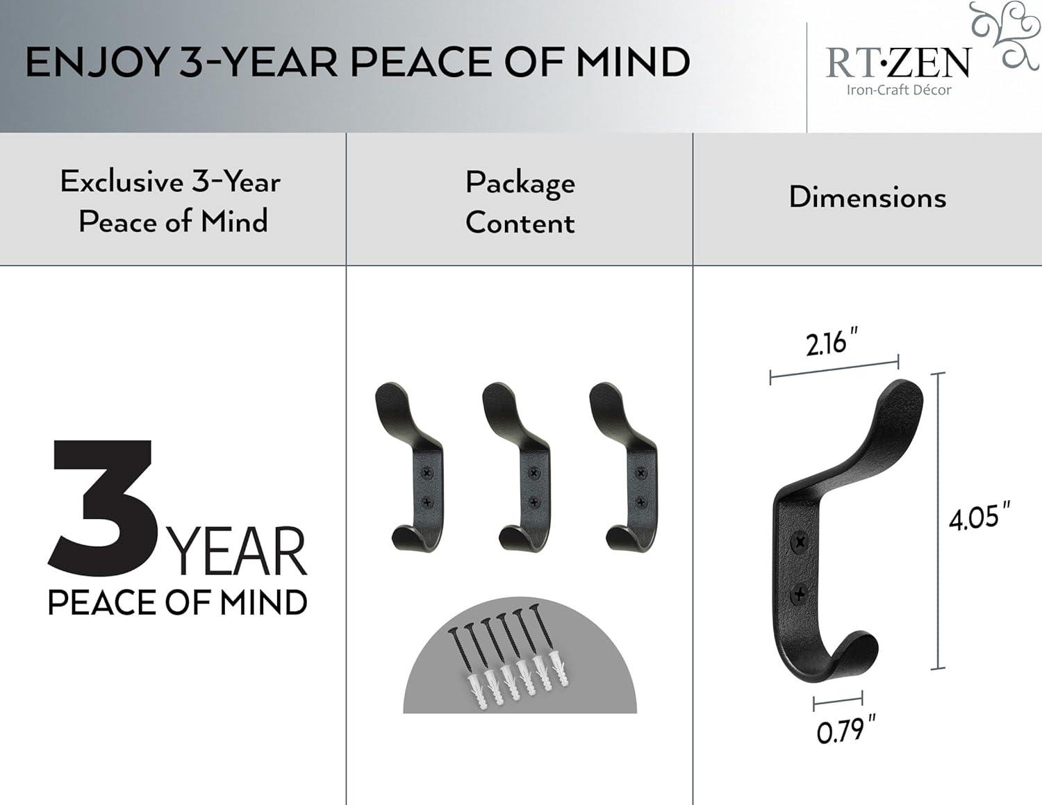RTZEN Wall Mount Hook Set - Wrought Iron Decorative Rustic Metal Coat Hooks for Hanging - Handcrafted Classic Farmhouse Wall Mounted Black Hooks for Towel Robe or Hat Hanging - 3 Pack