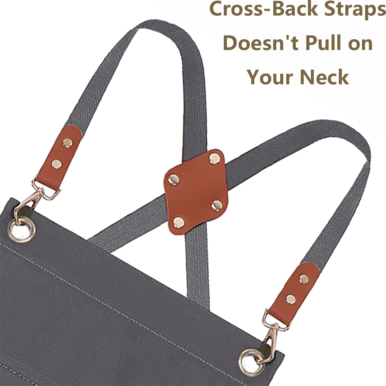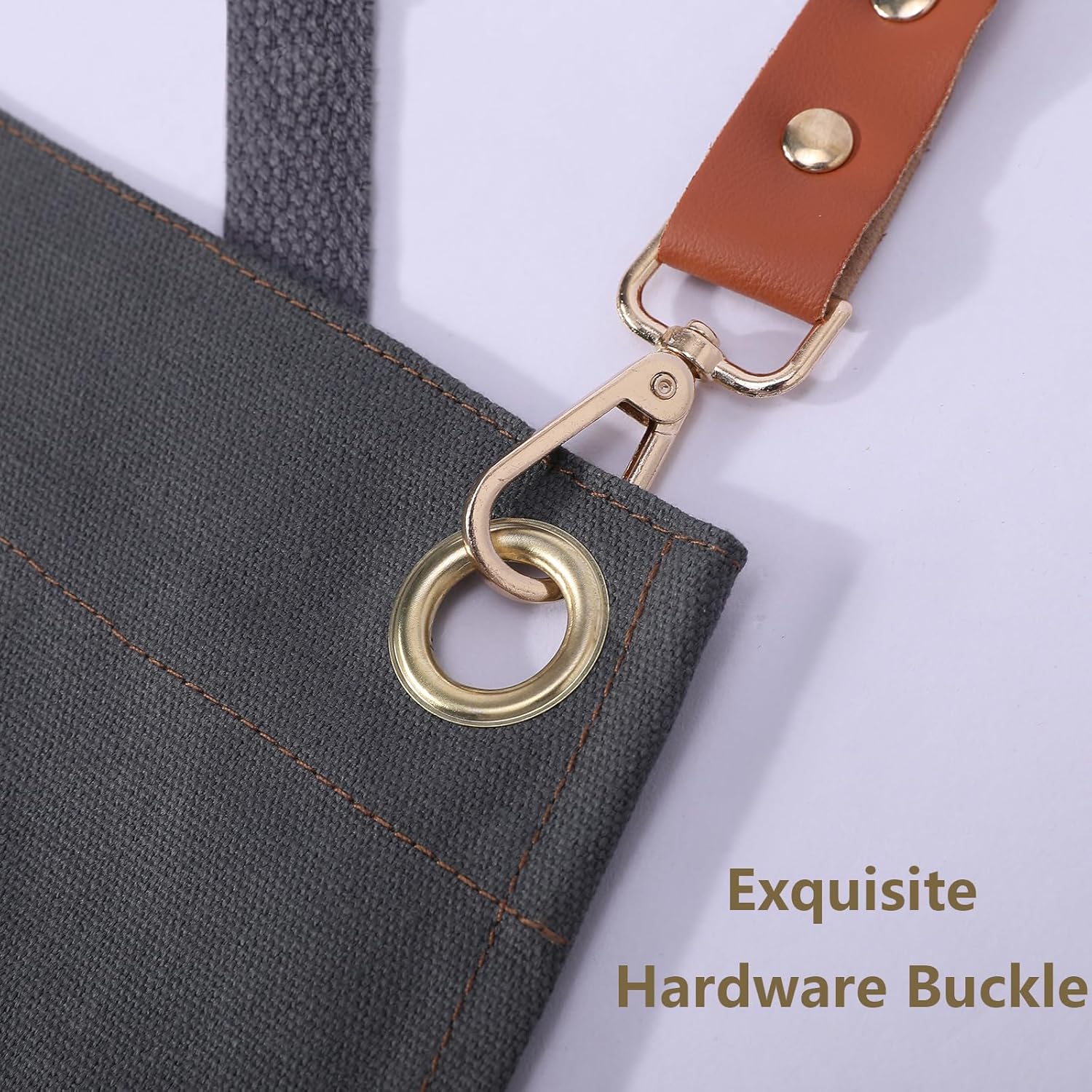 - Comfortable to wear: This kitchen apron has a cross back design that does not pinch your neck. This chef apron is made of high-quality brass metal fasteners and faux leather, and there are leather buckles on the back to fix the two detachable shoulder straps, which is more convenient to put on and take off. The apron is fully handmade and is comfortable to wear for a long time.