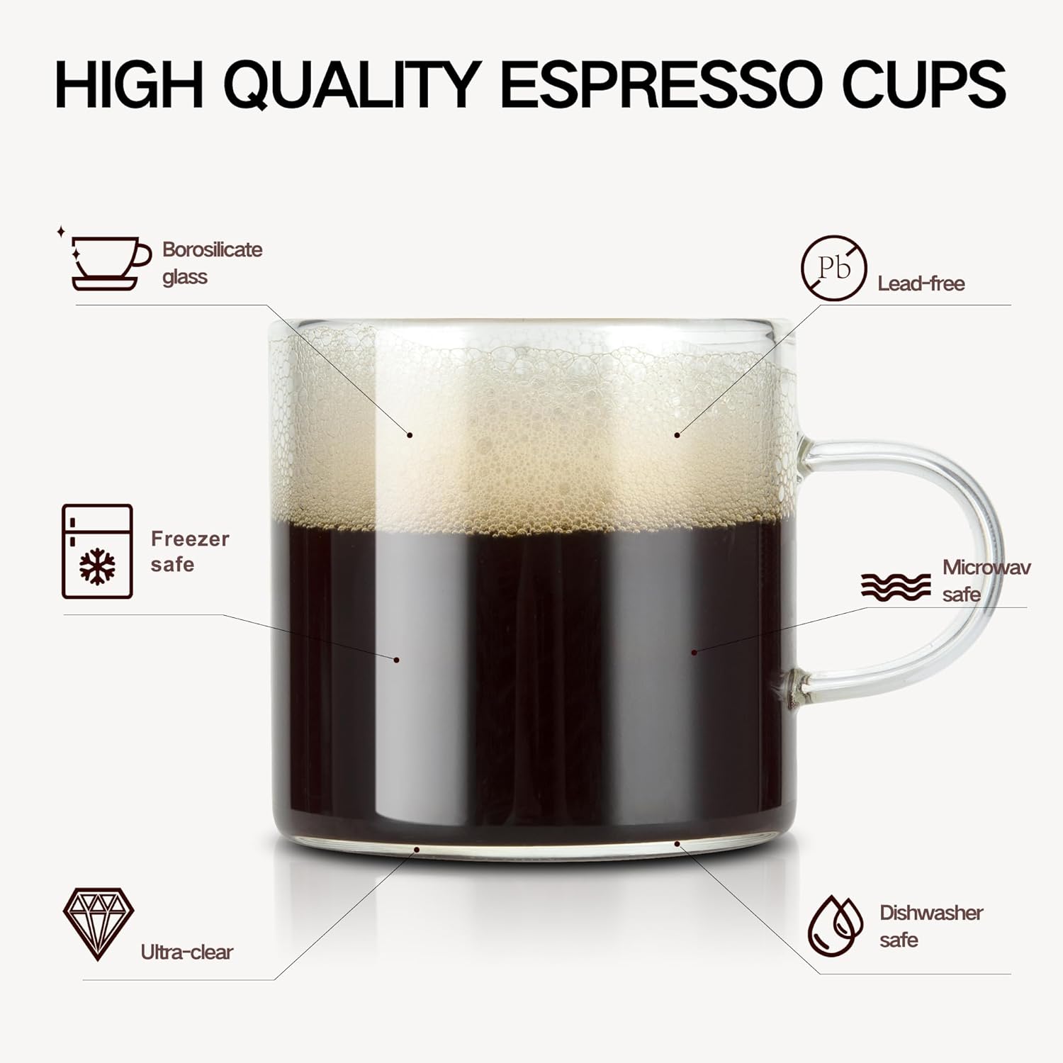 - 【High end glass material】Our cappuccino cups is made of glass, The material used in our espresso shots is borosilicate glass, so the cups are very light to hold in the hand. You can listen to their crisp sound by hitting.The body of the cup is crystal clear and translucent, and the mouth of the cup is smooth.