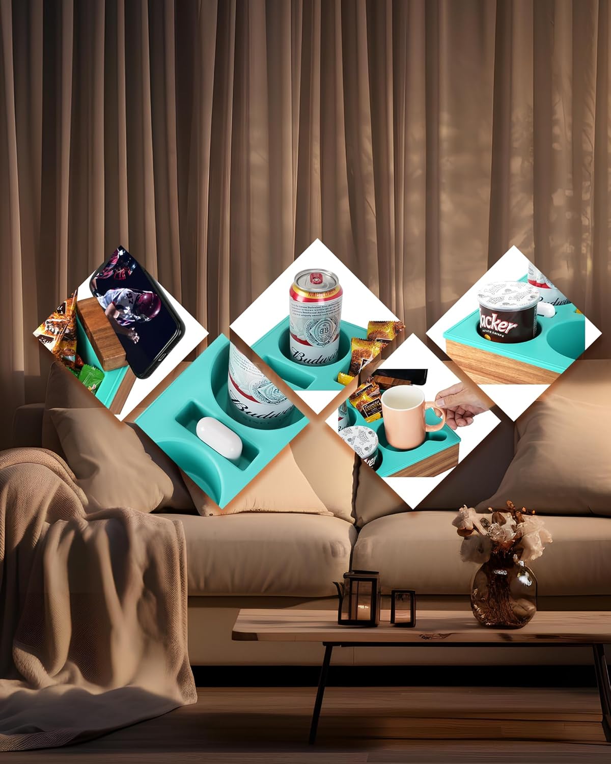 - ✅[Soft Silicone+ Sturdy Wooden Boards]: The sofa cup holder is made of food-grade silicone and wooden boards, so the couch drink holder can keep their original shape without deformation even after long-term use. The smooth silicone material of the couch drink holder won't produce scratches, the couch caddy is waterproof and unbreakable, and the couch tray can be cleaned by gently wiping. The tray table also adds a touch of personality and charm to their interior accessories.