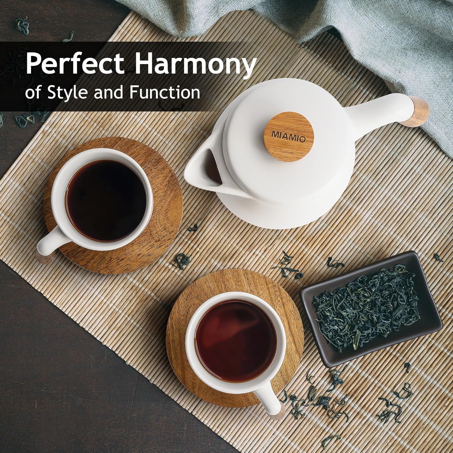 MIAMIO – 34 Oz Ceramic Tea Pot Set with Infuser and Cups/Tea Strainer, 4 Ceramic Tea Mugs (10 Oz), Bamboo Saucers/Handle for Home and Office (White)