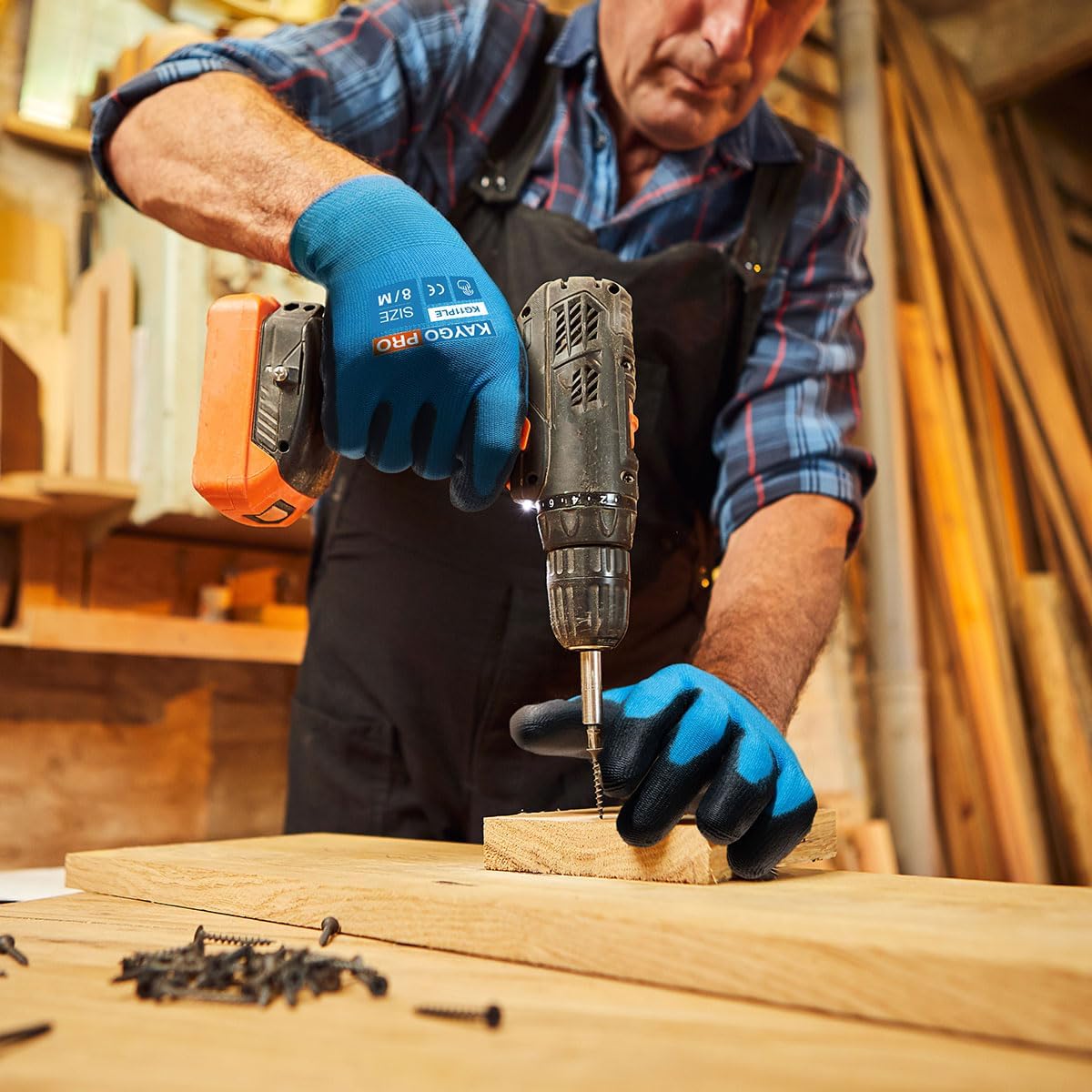 KAYGO Safety Work Gloves PU Coated for Men and Women, KG11P 12 Pairs Seamless Knit Glove with Two Fingers Touchscreen,Ideal for General Duty Work (Blue,M)