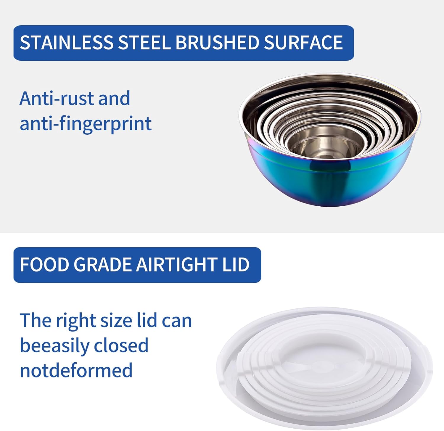 - 【 Premium Quality Mixing Bowls 】 - Decorate your kitchen in style with this modern rainbow mixing bowl set. These colored Mix bowls are designed extra deep to prevent spills and splatter. Steel bowls are built with a flat base to stabilize and a flat rim to create an easy grip.different bowls in 7 different sizes: 7,3.6,2.7,2.1,1.5,1.1,0.8QT. These bright, cheerful and colorful bowls will add a splash of fun to your kitchen, family dinner or office potluck