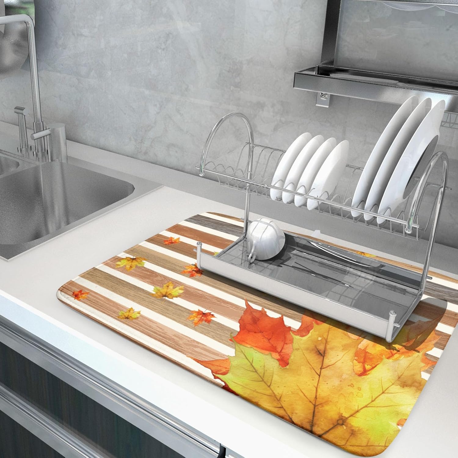 Autumn Golden Maple Leaf Dish Drying Mat for Kitchen Counter,Rural Wood Light Brown Stripes Drying Mat 18 x 24 Inch Microfiber Dish Drying Pad Dish Rack Drainer Mat for Coffee Bar