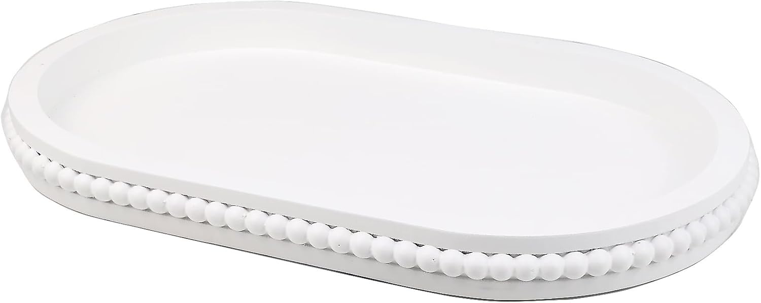 Oval Wood Serving Tray with Wooden Beads, Outdoor Farmhouse Decorative Tray for Ottoman, Coffee Table, Kitchen Counter Organizer, Home Decor(White)