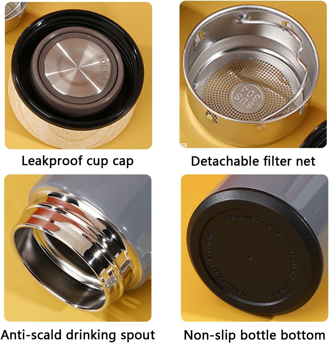 - 【EASY TO CLEAN】The inside of the lid is embedded with PP leak-proof silicone ring. Simple structure, washable with a spout removed,The cup mouth is smooth, it will not cut lips, the cup has large diameter, It has detachable filter net, can filter the residue such as tea. The bottom of the cup is made of non-slip material, which is not easy to slip off and is durable.