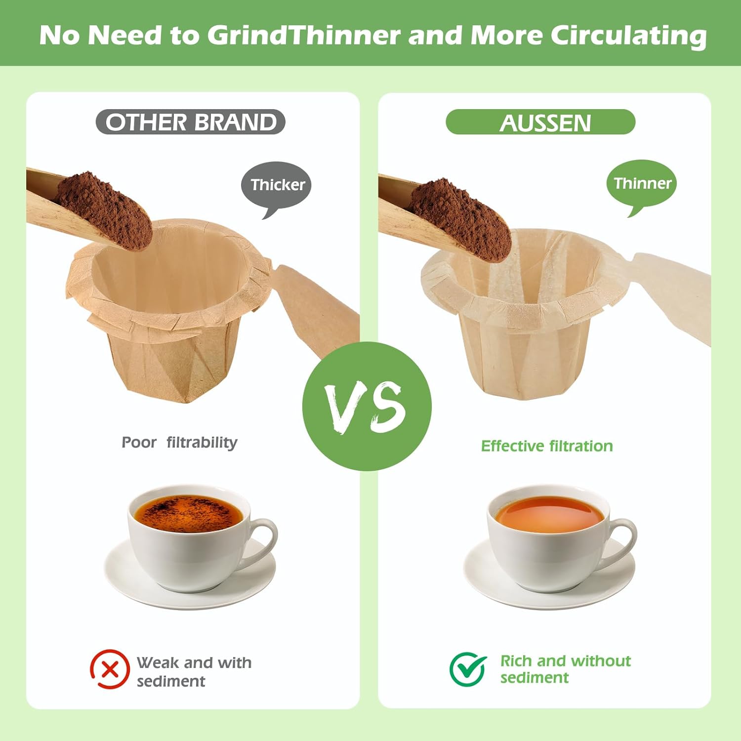- 【Nice Thickness】: The filter paper neither too thin to be split up or leak, nor too thick to make the coffee weak. Thinner but better flow through.Fits Into Most K-cups Paper Filters,Easily Flow Through With Good Test No Grounds: good quality disposable coffee filters help you to make a nice cup of coffee with good taste. Filter paper can filter most of coffee grounds and make the taste more silky and crema rich