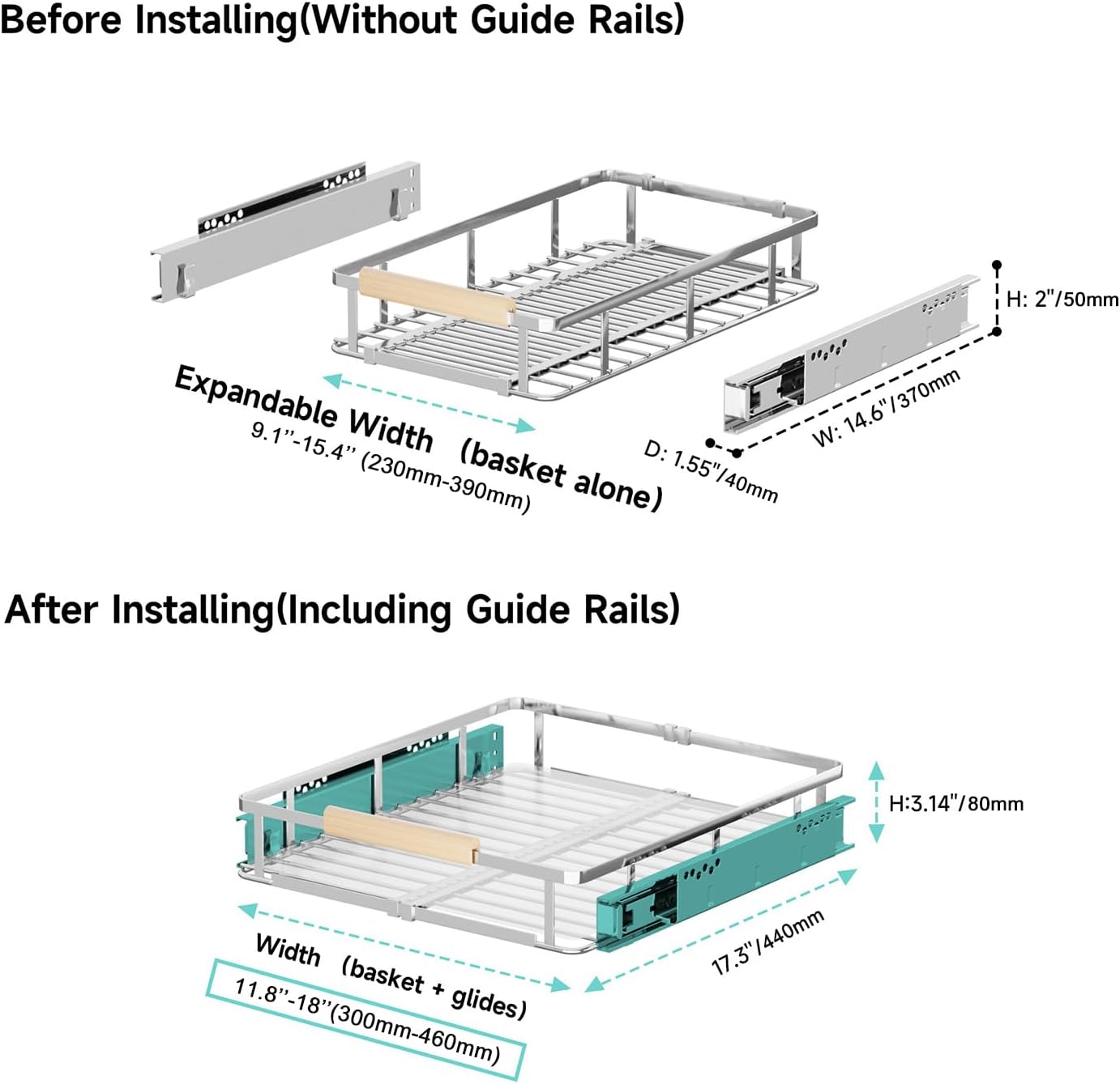 - Sturdy and Reliable Materials: Our pull out drawers for cabinets made of high quality chromed stainless steel, prevent scratches, not easy to rust and deform, and features excellent stability. Smooth surface and chrome color can be matched with various style of cabinets, suitable for variety of family styles.