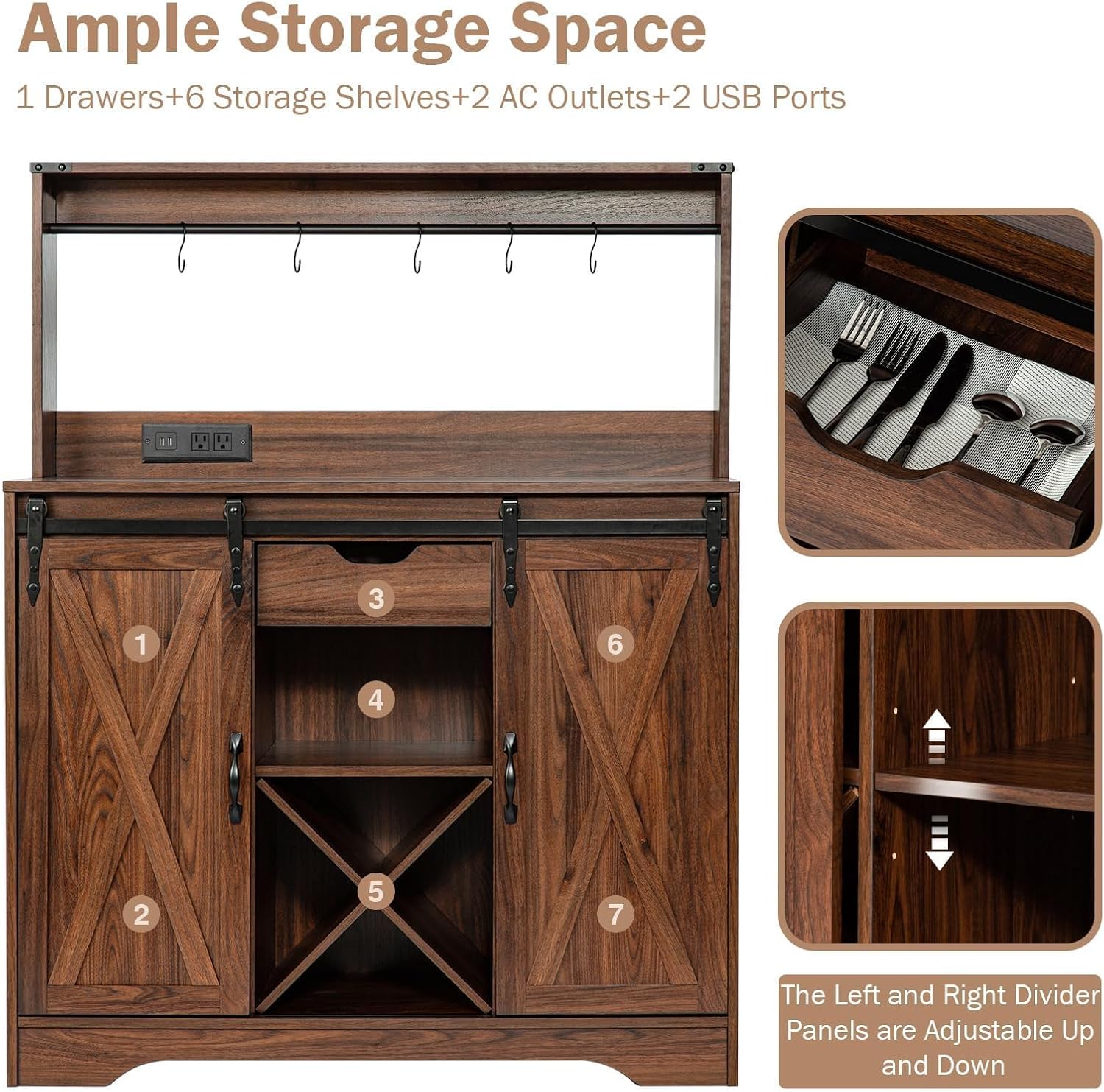Wnutrees Farmhouse Coffee Bar Cabinet with Charging Station and USB Ports, Sliding Barn Door, 39" Kitchen Hutch Sideboard Buffet Storage Cabinet, Fits Kitchen Dining Living Room, Brown