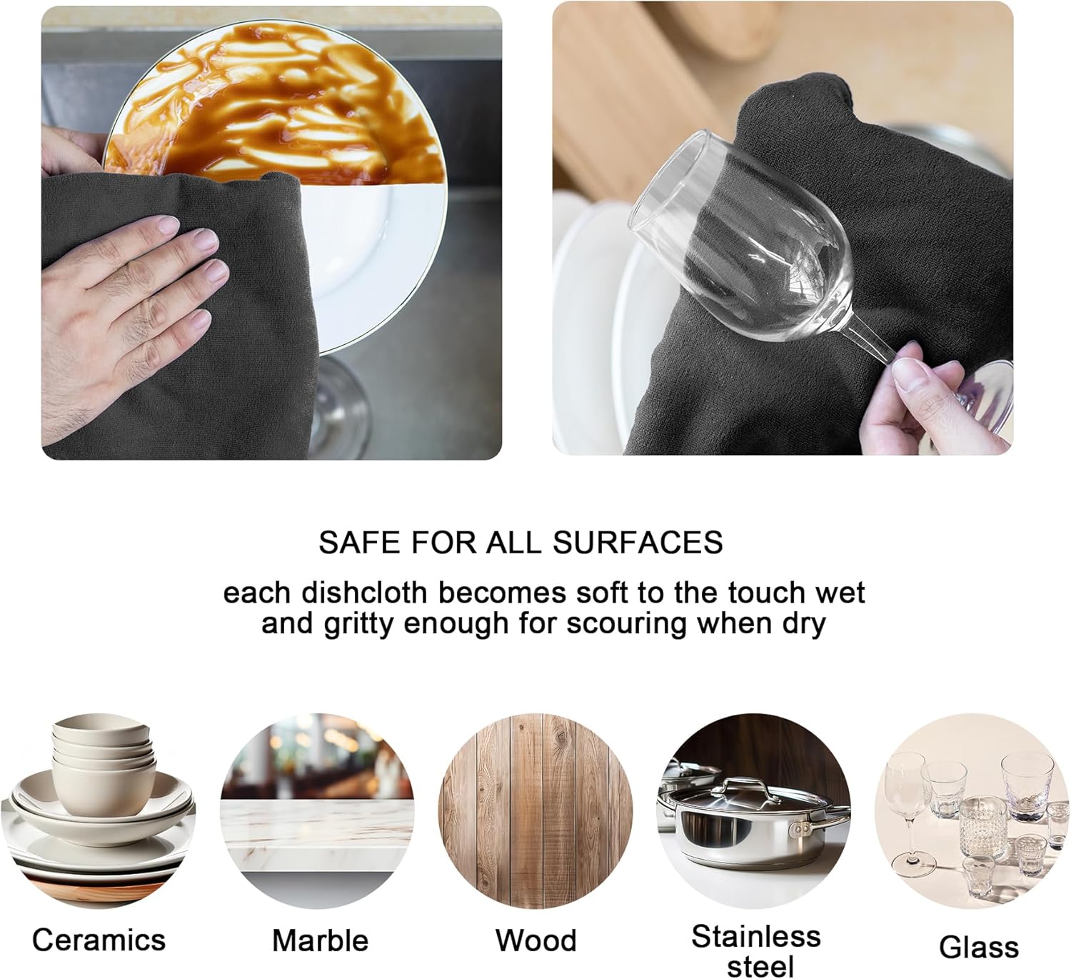 - HIGH QUALITY MATERIAL - Our dish rags are made of high quality non-abrasive and extra soft coral velvet thickening material, which is not easy to lint and fade, soft and not hurting hands, natural and without any chemicals. These dish cloths are not only suitable for kitchen cleaning, but also suitable for cleaning home furniture, car, window, electric appliance etc. It’s so easy to remove dust, dirt, stain, grease, fingerprints.