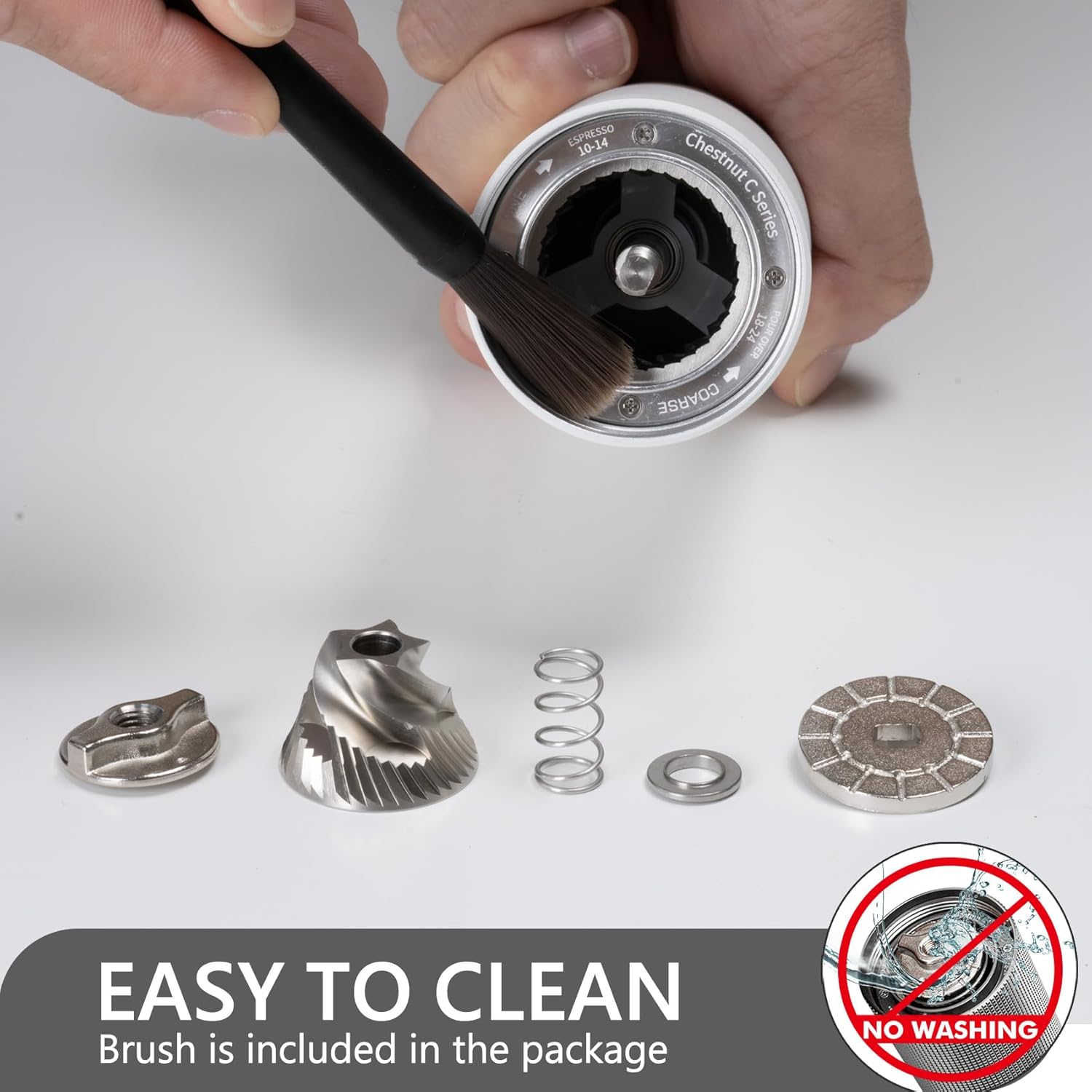 - [ Easy Clean & Carry ] Coffee grinder body weighs 700g, while maintaining a lightweight and a moderate sense of weight and luxury. It is ideal not only for home use but also for carrying outdoors or traveling. Easy to disassemble for cleaning - just be cleaned by brush.