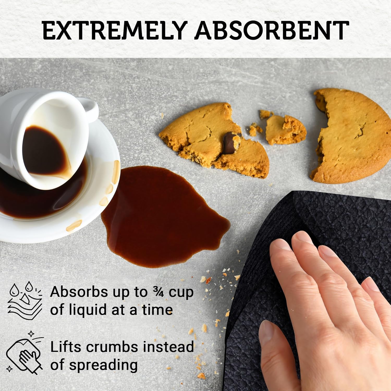 - Shockingly Absorbent cloths pick up water like a sponge. Each cleaning cloth absorbs more than half a cup of liquid before needing to be wrung out. They also pick up dry particles (like crumbs, flour, dust etc.) instead of spreading them around like other kitchen rags. Unlike sponges however their large flat composition makes them dry fast, avoid bad smells, and clean more- faster. Now you can up your game by using these Swedish dish towels for kitchen use or anywhere around the house (or car!)