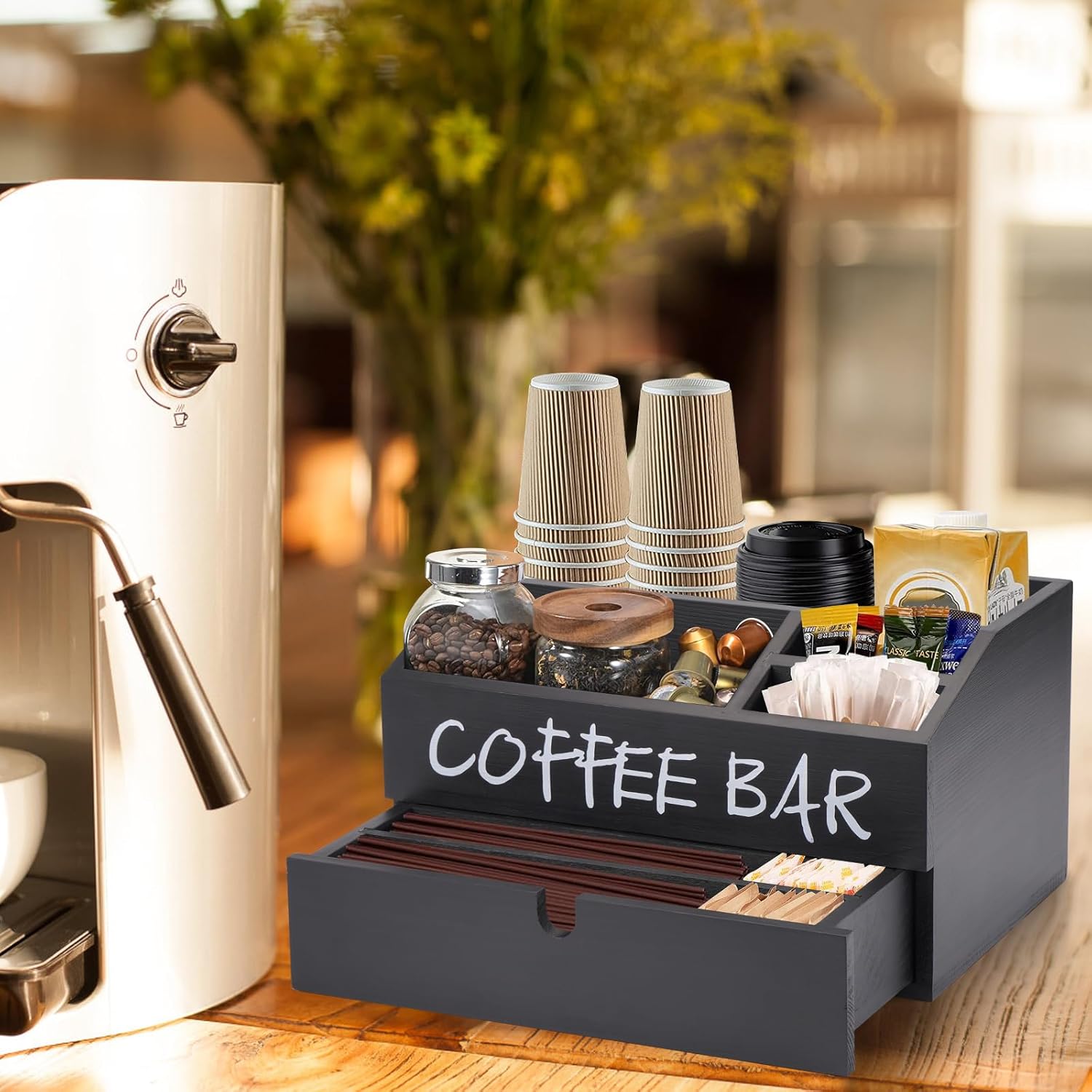 Coffee Station Organizer, Wood Coffee Bar Accessory with Drawer, K Cup Condiment Organizer & Pod Holder (30x20x16cm) - Black
