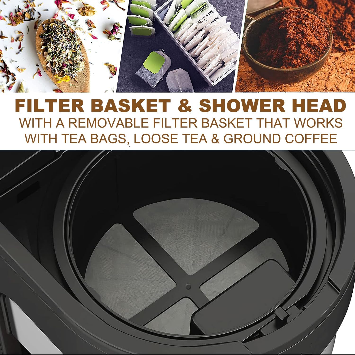 - Filter Basket & Shower Head: The removable filter basket works with fresh ground coffee, tea bags and loose leaf teas, while the shower head is designed for complete saturation and optimal flavor extraction