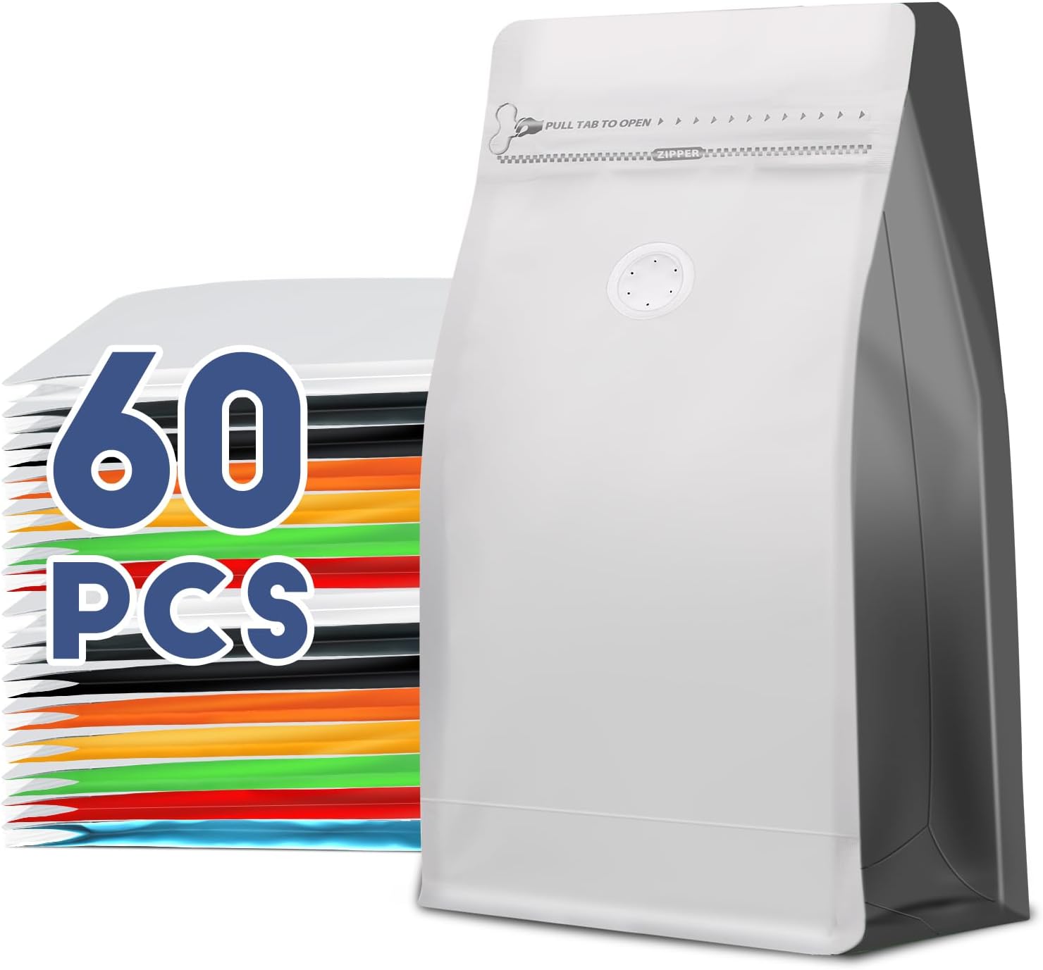 Coffee Bags with Valve(60pcs,8 oz,1/2 lb) Vented Coffee Beans Packaging Bags High Barrier Aluminumed Foil Flat Bottom Heat Sealed Side Zipper Resealable Storage Bag for Home or Business (White+Gray)