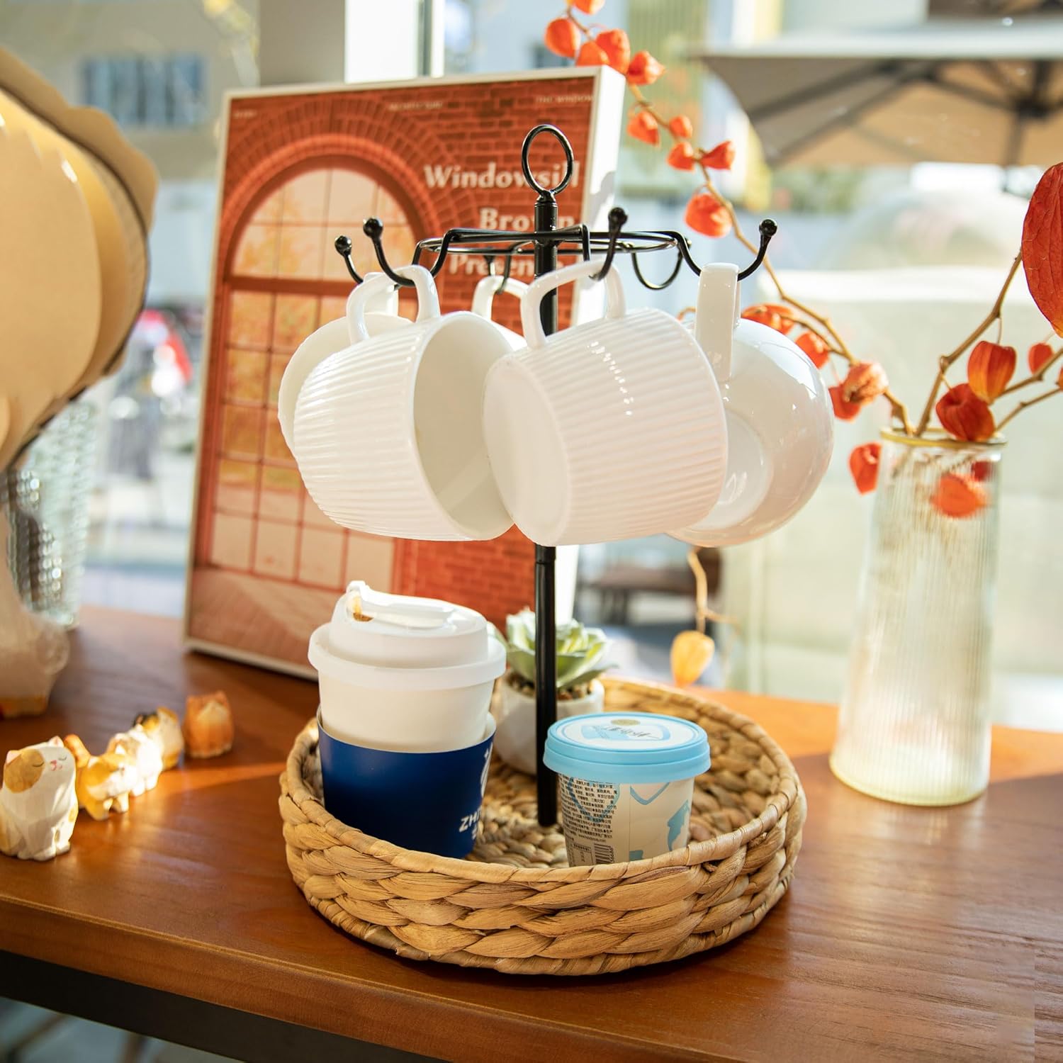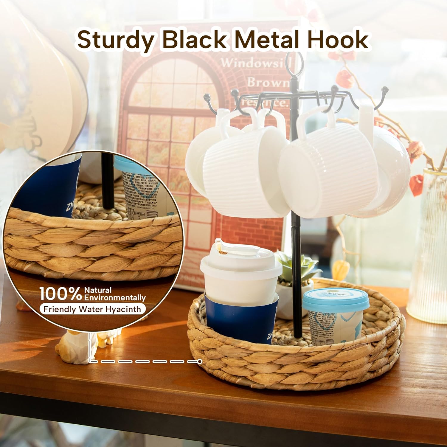 - 【Modern Unique Design 】Crafted with natural water hyacinth, our coffee mug holder not only adds a touch of natural sophistication to your coffee station, The easy-to-carry metal handles make it a breeze to move around, ensuring your coffee mug holder essentials are always within reach.