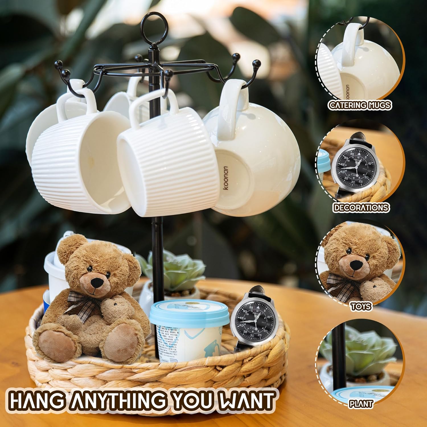 - 【Space Saving】 Measuring a convenient 9.45x13.78 inches, this compact dual layer coffee rack is a space-saving powerhouse. The upper tier, equipped with sturdy metal hooks and handles, offers quick access to your coffee accessories holder , while the lower tier boasts an elegant water hyacinth woven storage basket. Built to with large mug display rack stand the daily demands of coffee lovers.