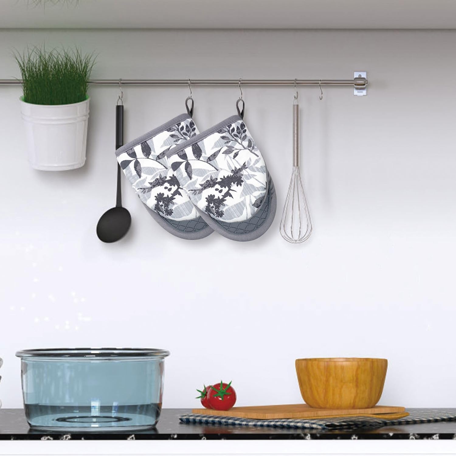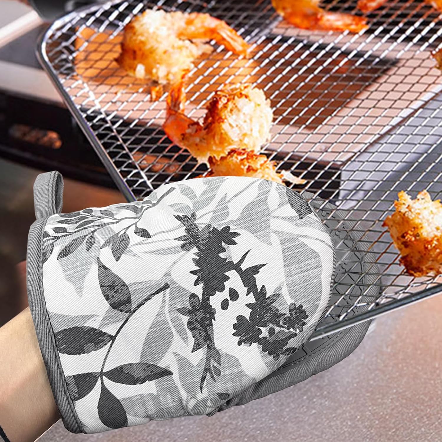 Mini Silicone Oven Mitts, Heat and Slip Resistant Kitchen Mittens 2-Pack Set, Foliage Flower Soft Short Oven Gloves, Flexible Thick Pot Holders for Safe Cooking Baking and Grilling (Grayish)
