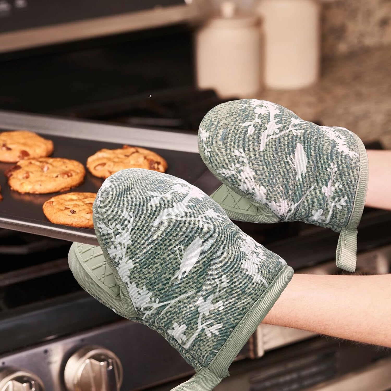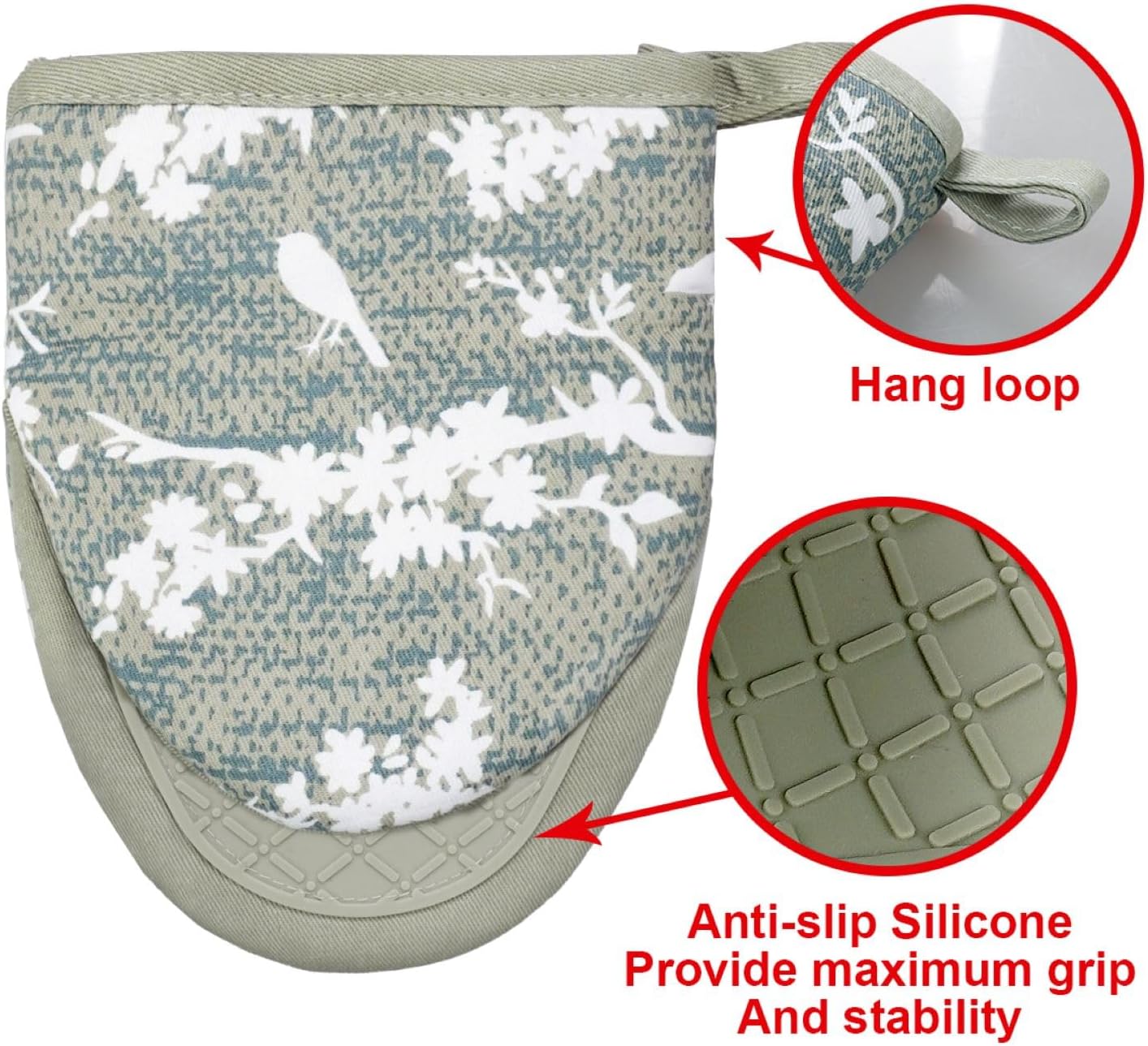 Mini Silicone Oven Mitts, Heat and Slip Resistant Kitchen Gloves 2-Pack Set, Birds Flower Soft Short Oven Mittens, Flexible Thick Pot Holders for Safe Cooking Baking and Grilling (Mini, Aqua)