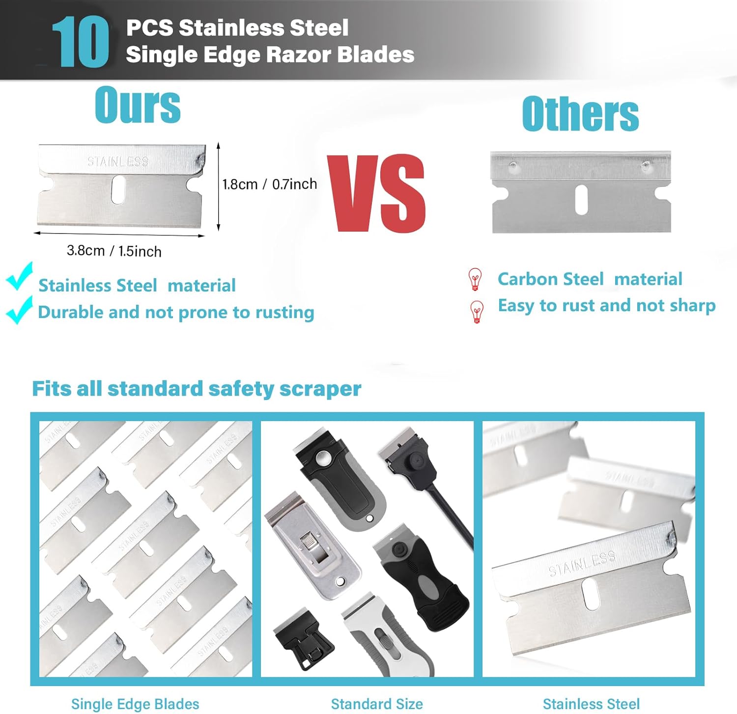 - 10pcs stainless steel scraper blades, fits all standard safety scraper,compared to other carbon steel blades, stainless steel blades are more durable and less prone to rusting