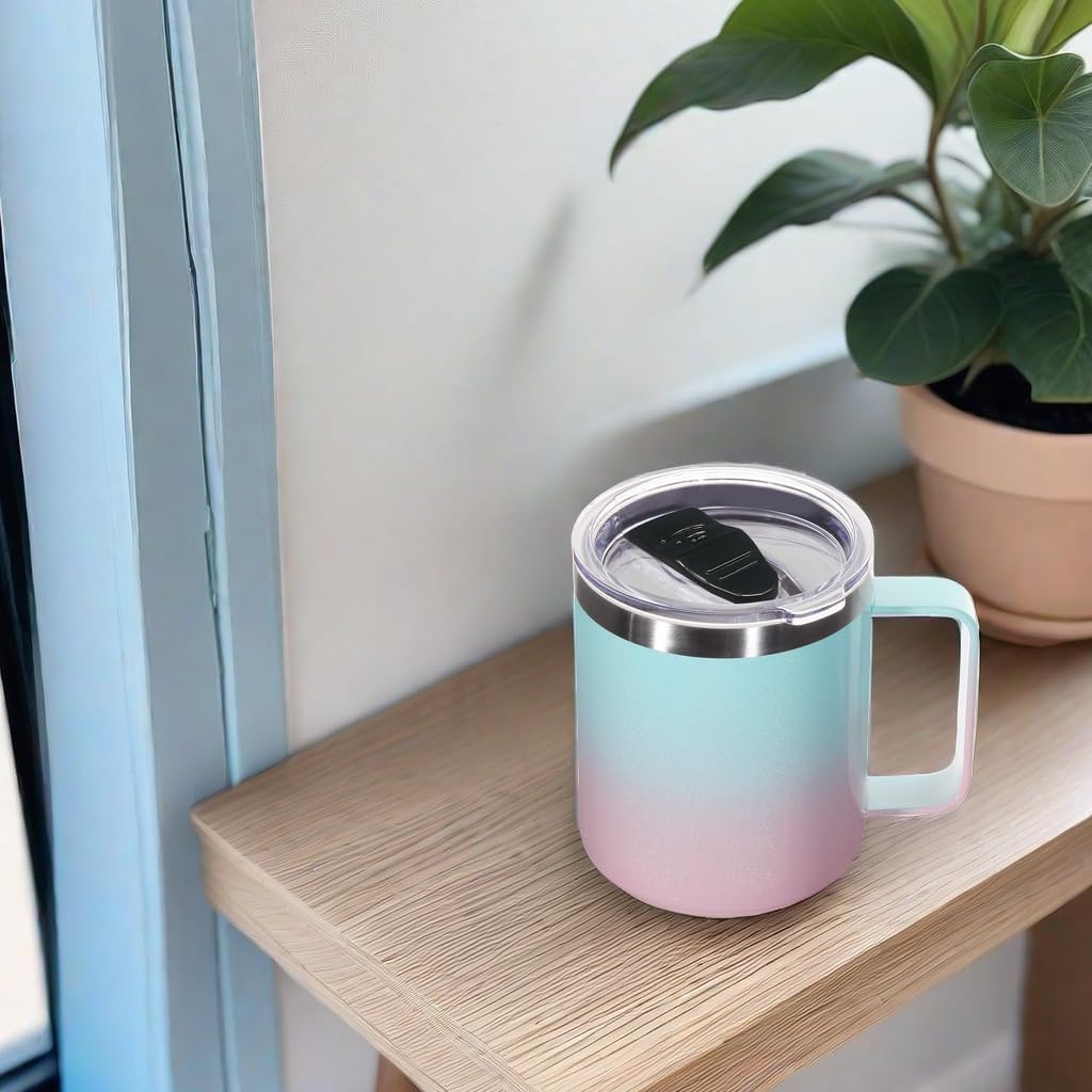 Volhoply 14oz Insulated Stainless Steel Coffee Mug with Lid Bulk 4 Pack,Double Wall Vacuum Travel Coffee Cup with Handle,Reusable Cups Tumbler,Camping Mugs Keep Hot,Ideal Gifts(Green Pink,4)