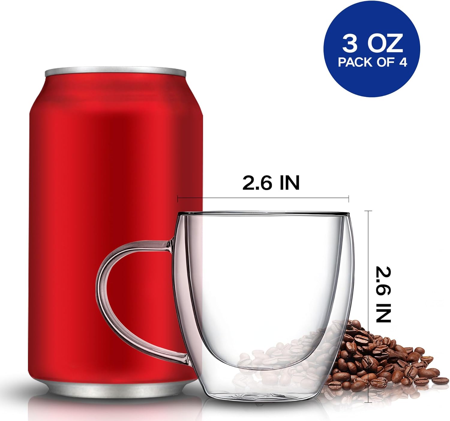 Set of 4 Double Walled Glass Coffee Mugs 3 Ounces Insulated Layer Coffee Cups with Handle Borosilicate Glass Espresso Cup for Hot Beverage,Cappuccino,Tea,Latte,Wine,Microwave Safe