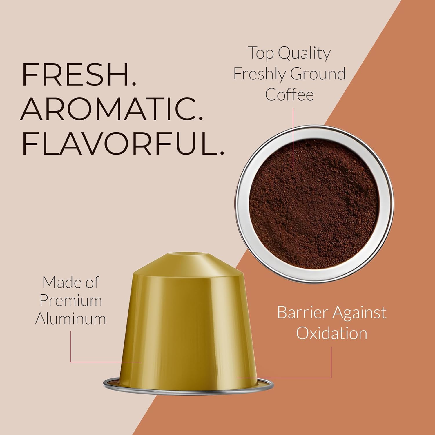 - Aluminum Espresso Capsules: Since our flavored coffee pods are aluminum, our espresso stays fresh, aromatic, and flavorful. It keeps our espresso coffee cups from oxidizing. So, you can enjoy our excellent coffee anytime, anywhere.