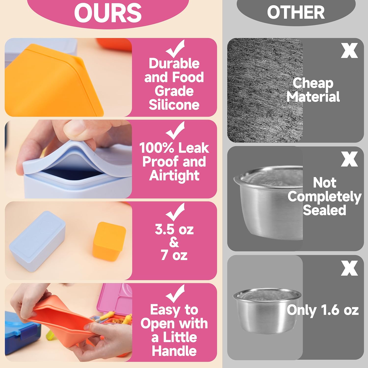 - đăFood-Grade SiliconeăVIOTIIN Dip Containers for food storage use premium food-grade silicone that is free of BPA, PVC, Latex and Phthalates. They are lightweight, durable and very convenient to carry on the go.