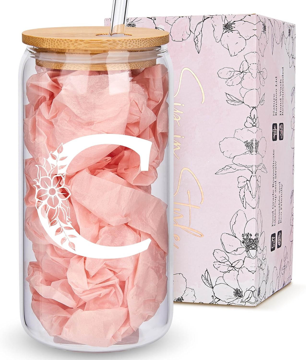 Personalized Gifts for Women, Monogrammed Glass Cups with Lids and Straws, Custom Tumbler, Cute Customized Mug, Aesthetic Stuff, Initial Iced Coffee Cup, Drinking Glasses, Birthday Teacher Gifts, C