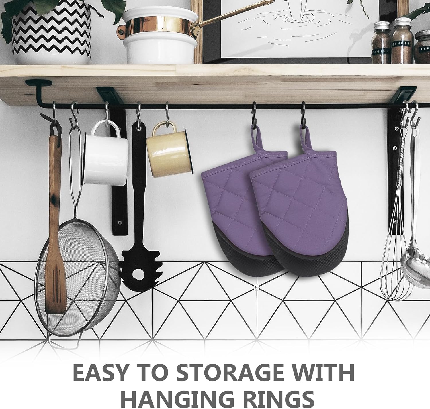- 【Easy Clean & Storage】- If you get any food on them while wearing, just gently swish around in soapy water or just wipe them clean. Both the surface of silicone and inner lining can be cleaned. You can hang it up with the nice hanging hook in the cuffs.