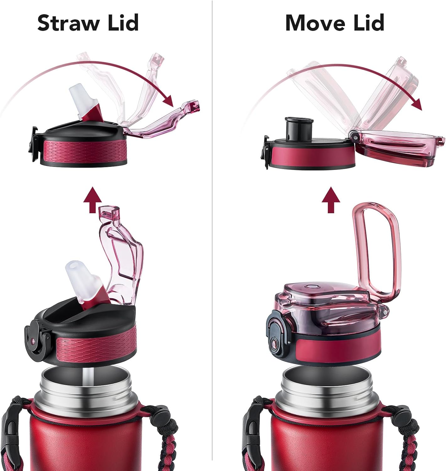 - Insulated water bottle 24 oz: 24 oz insulated water bottle has a matte finish and comes with 2 lids (Lid with Straw/No Straw) and a Paracord handle for easy portability; Its wide mouth makes it easy to fill, pour, and clean, and the leak-proof cap ensures worry transport.