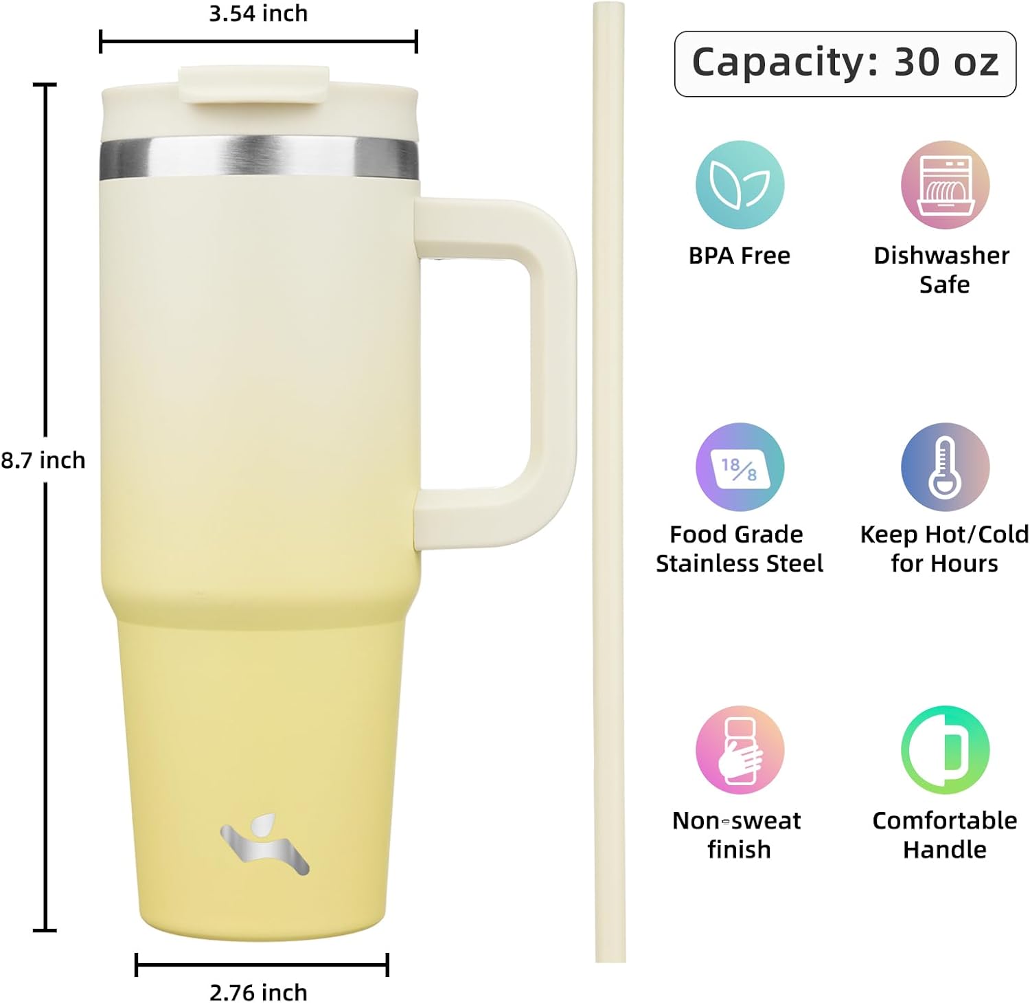 - Tapered shape designed slim-base makes the tumbler easily fit in most cup holders.Comfort and sturdy handle makes it easy to carry anywhere,suitable for short term driving, gym,office,picnics, or daily use at home