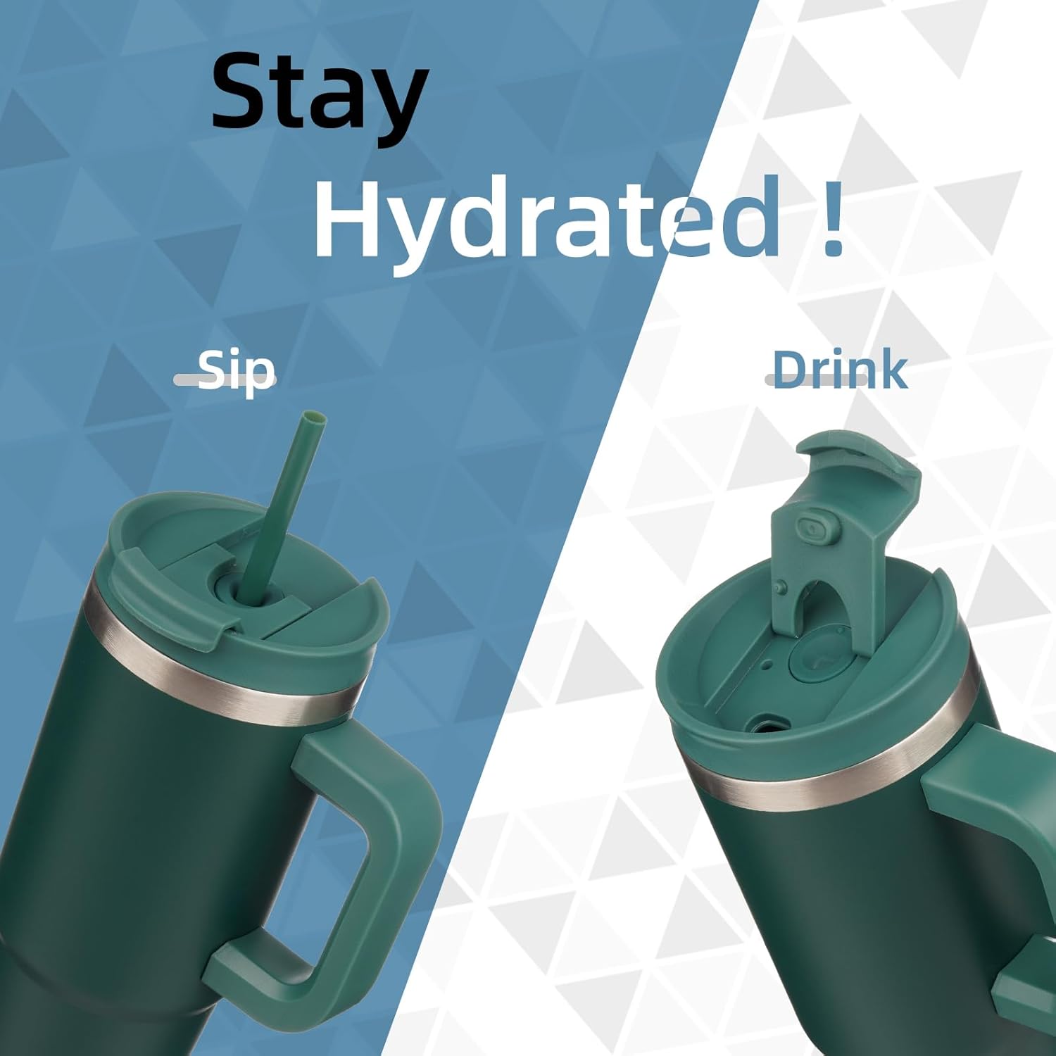 40 oz Tumbler with Handle and 2 Straws,2 in 1 Lid Insulated Water Bottle Stainless Steel Travel Coffee Mug,Dark Green