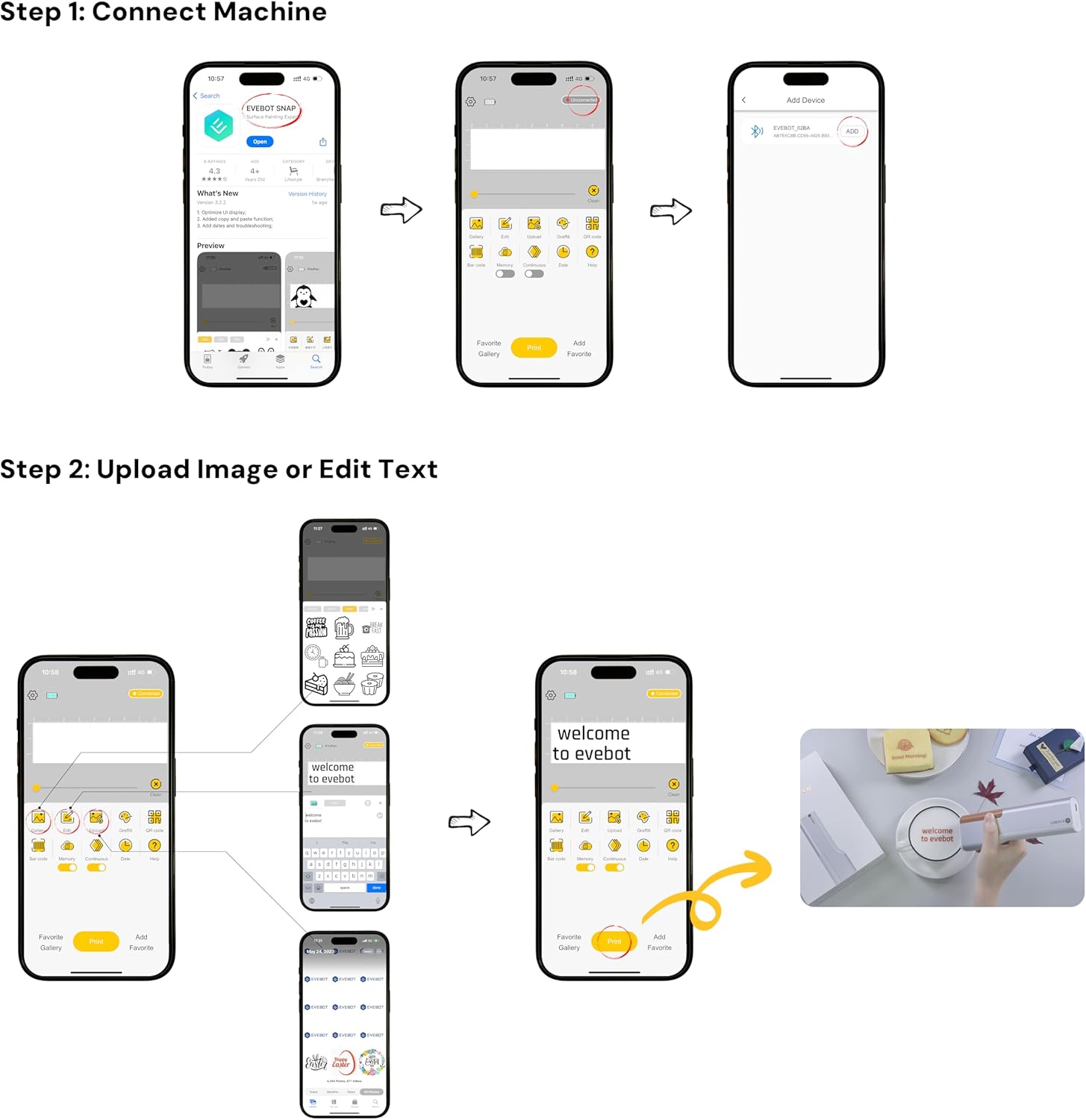 - EVEBOT Portable PrintPen: It is a handheld portable PrintPen made specifically for food surfaces. This safe and portable printing tool is ideal for customizing pictures, text, logos, dates, QR codes, barcodes and other personalized designs on frosting cookies, macarons, cakes and foam drinks. Suitable for restaurants, bakeries, cafes, bars and other places