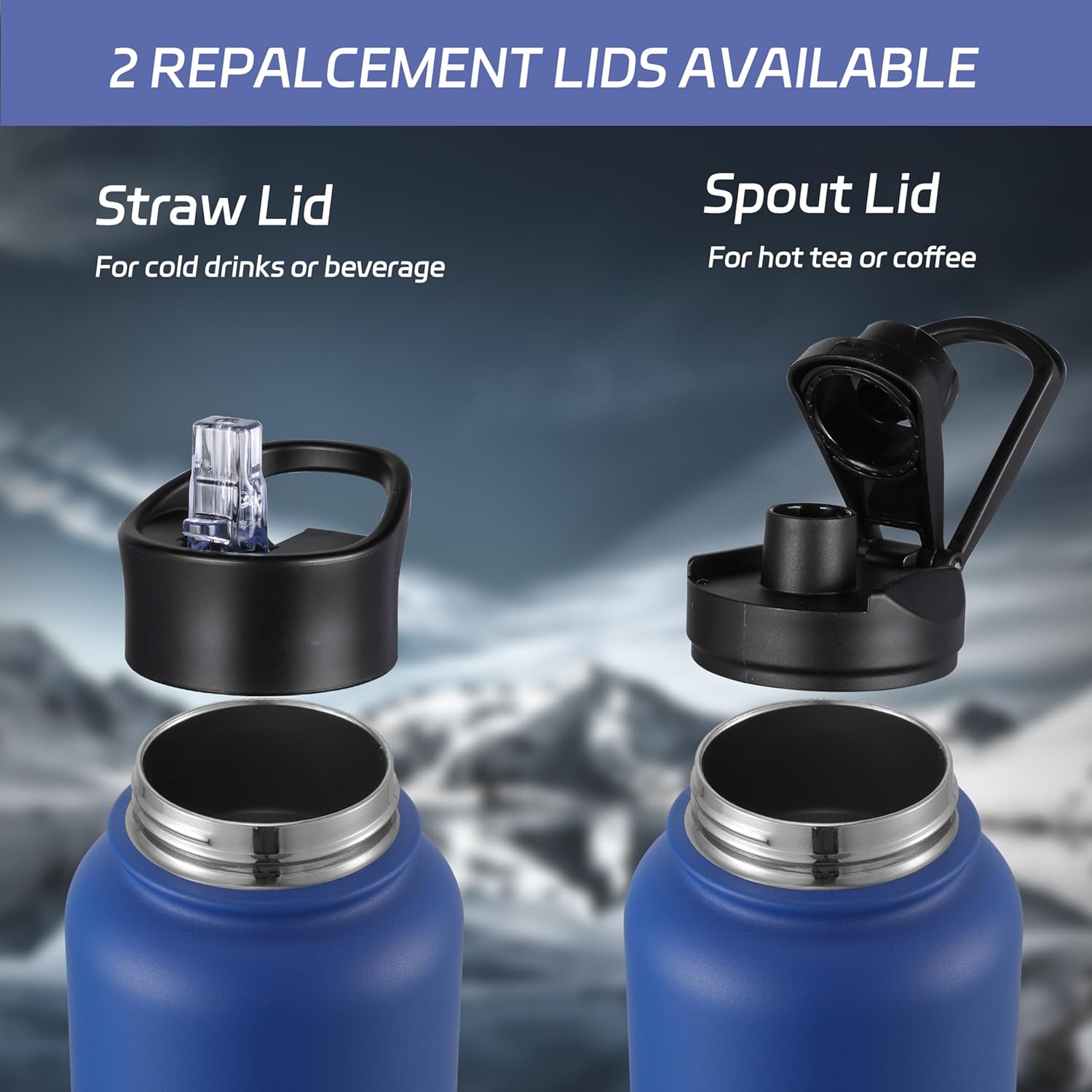 - 【STAY REFRESH THROUGHOUT THE DAY】It's easy to stay hydrated on exciting adventures with such a versatile bottle. Liquid can be fresh in its best taste for a whole day. The straw lid is ideal for cycling, hiking and gym while the spout lid is perfect for beach, camping and hunting.