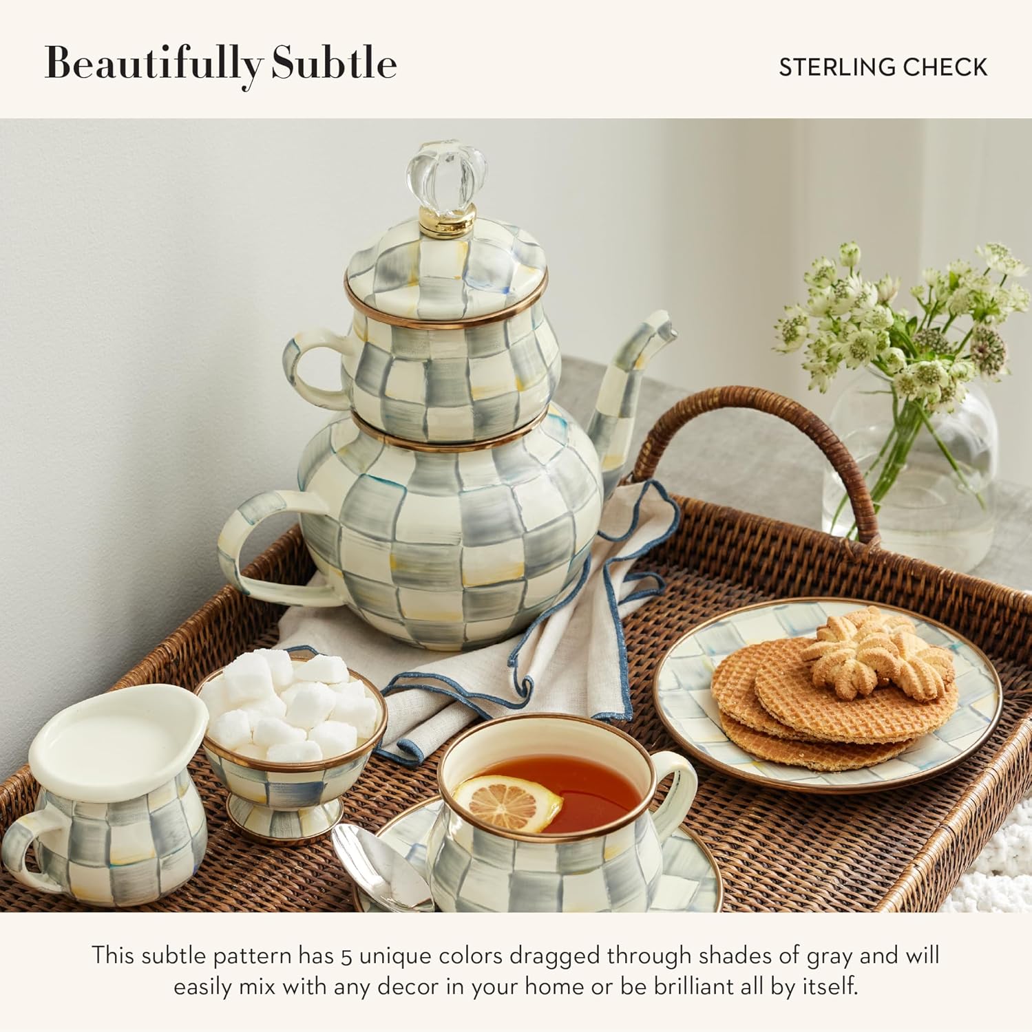- ELEGANT TEA FOR ONE: Our Sterling Check enamel high-tea set checks all the boxes for elegant enamel kitchenware. The tea kettle and cup feature our subtle pattern of hand-painted gray-and-white checks.