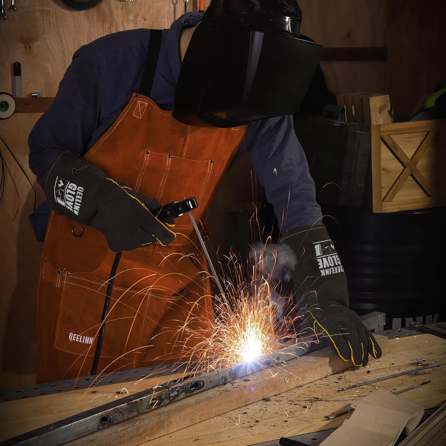 QeeLink Welding Gloves - Heat Resistant Leather and Fireproof Stitching for Fireplace Fire Pit Wood Stove BBQ Gardening Gear